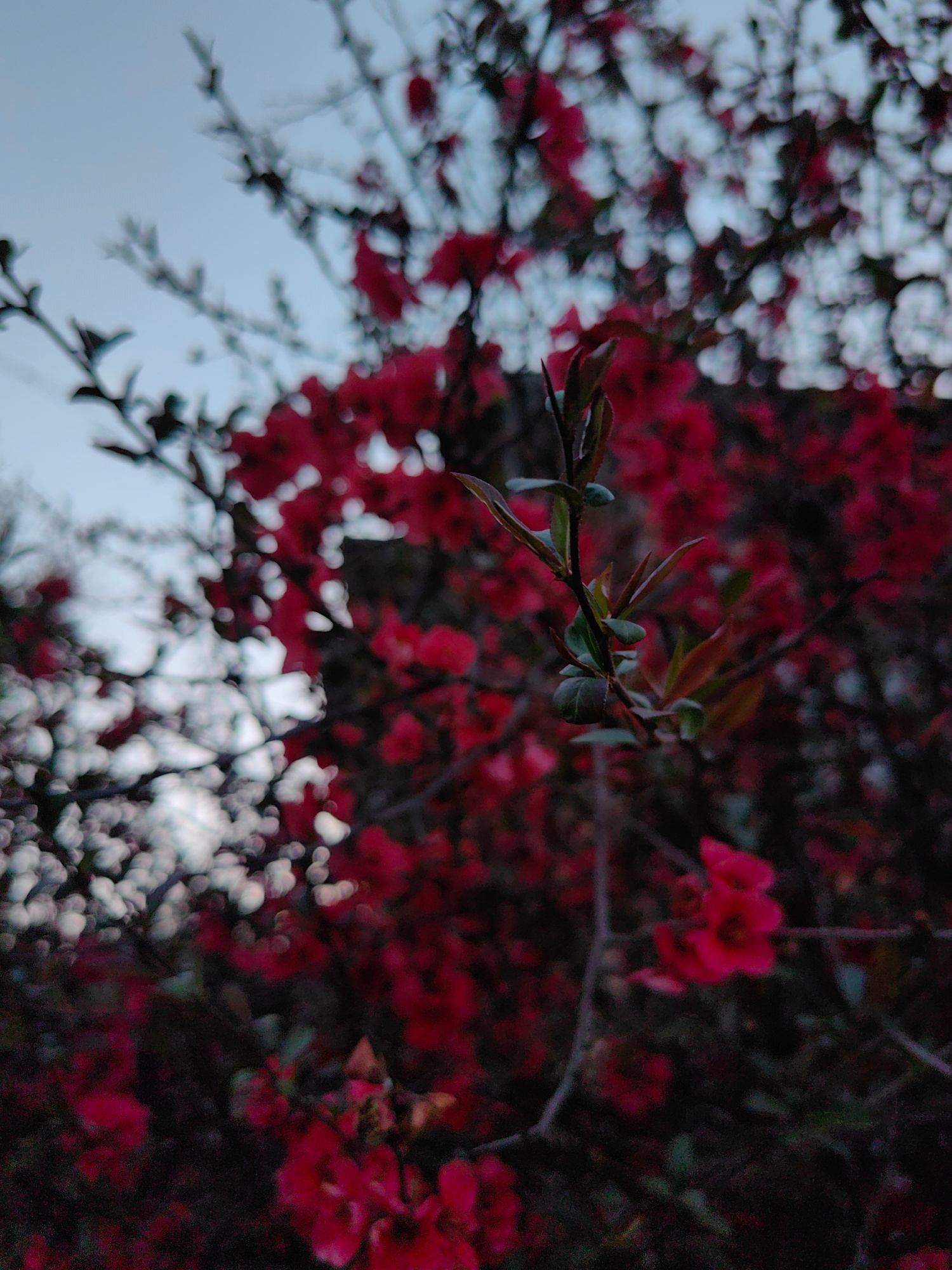 The image shows a flowering bush with red blossoms against a blurred sky background, possibly at dusk. A branch with new green leaves is in focus in the foreground. The location is not discernible fro…read more