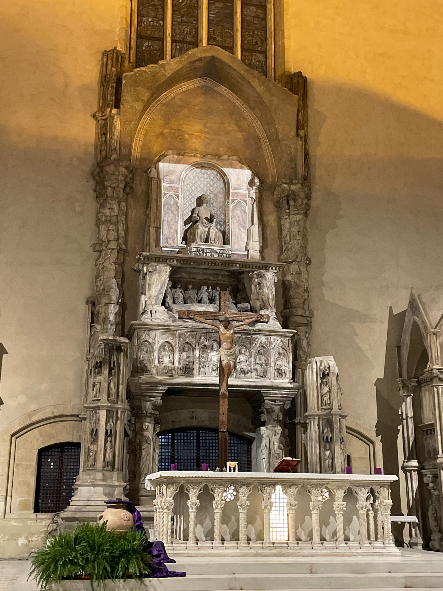 The image depicts the interior of the Basilica di Santa Chiara in Naples, Italy, focusing on the monumental Tomb of King Robert of Anjou and the altar positioned before it. The central subject is a m…read more