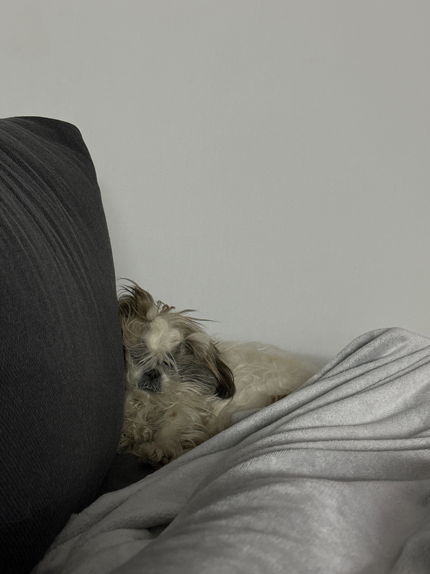 A medium shot depicts a small, long-haired dog sleeping on a dark grey cushion or pillow. The dog's fur is a mix of white and dark grey. A light grey blanket is draped over part of the dog. The backgr…read more