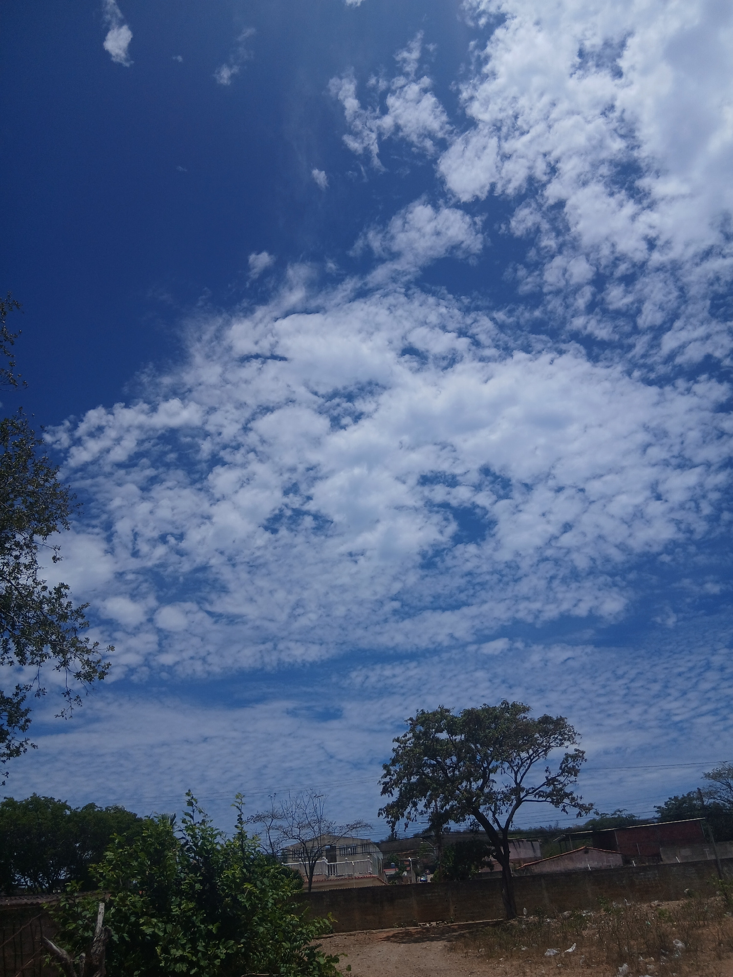 The image shows a view towards the sky in Juan Griego, Venezuela. A patch of clear, deep blue sky is visible in the lower left corner. The rest of the sky is filled with a layer of patchy white clouds…read more