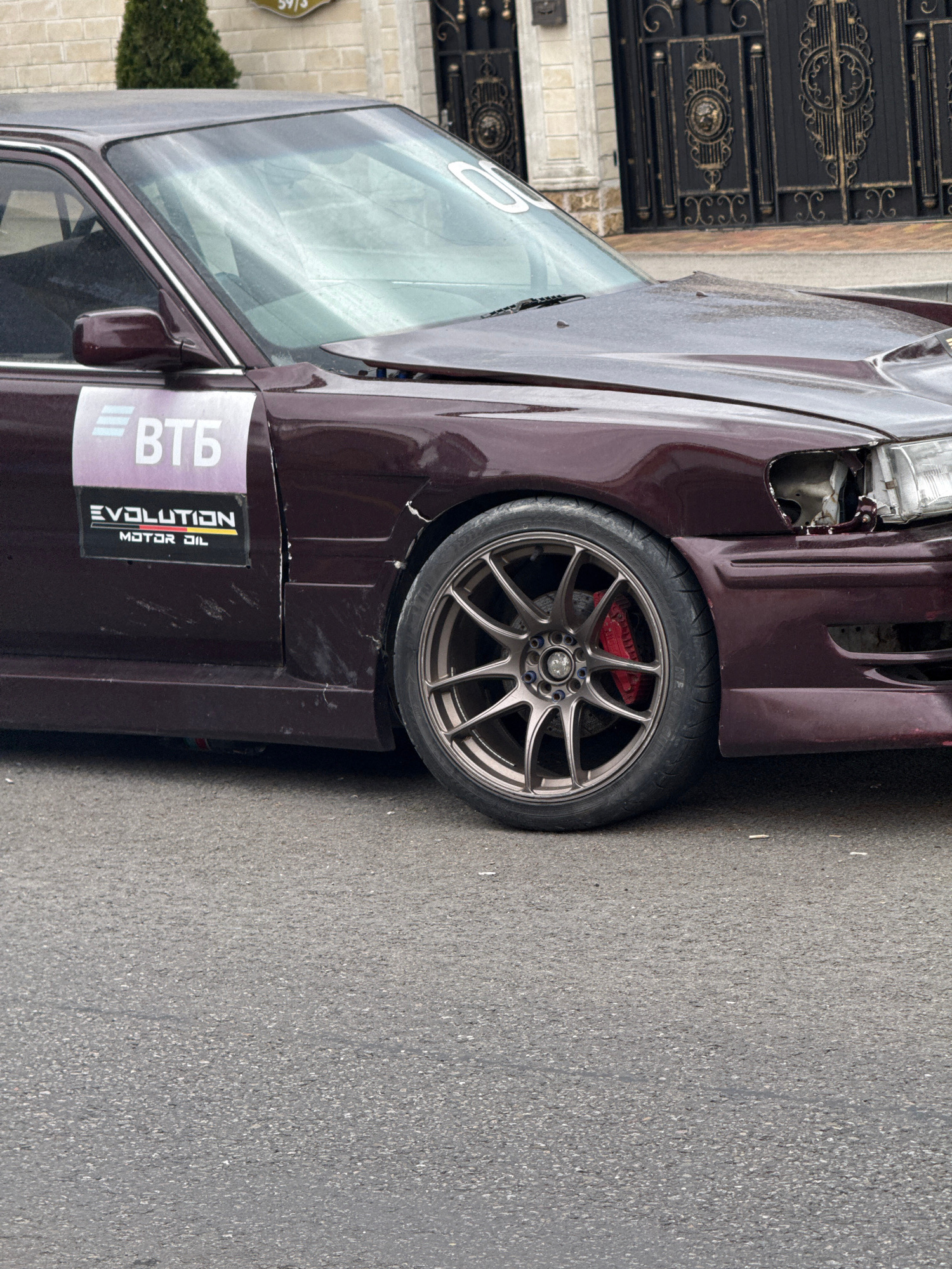 The image shows a damaged, maroon-colored car parked on an asphalt road. The car has a missing headlight and visible damage to the front fender. A sticker with "BTB" and "EVOLUTION MOTOR OIL" is on th…read more