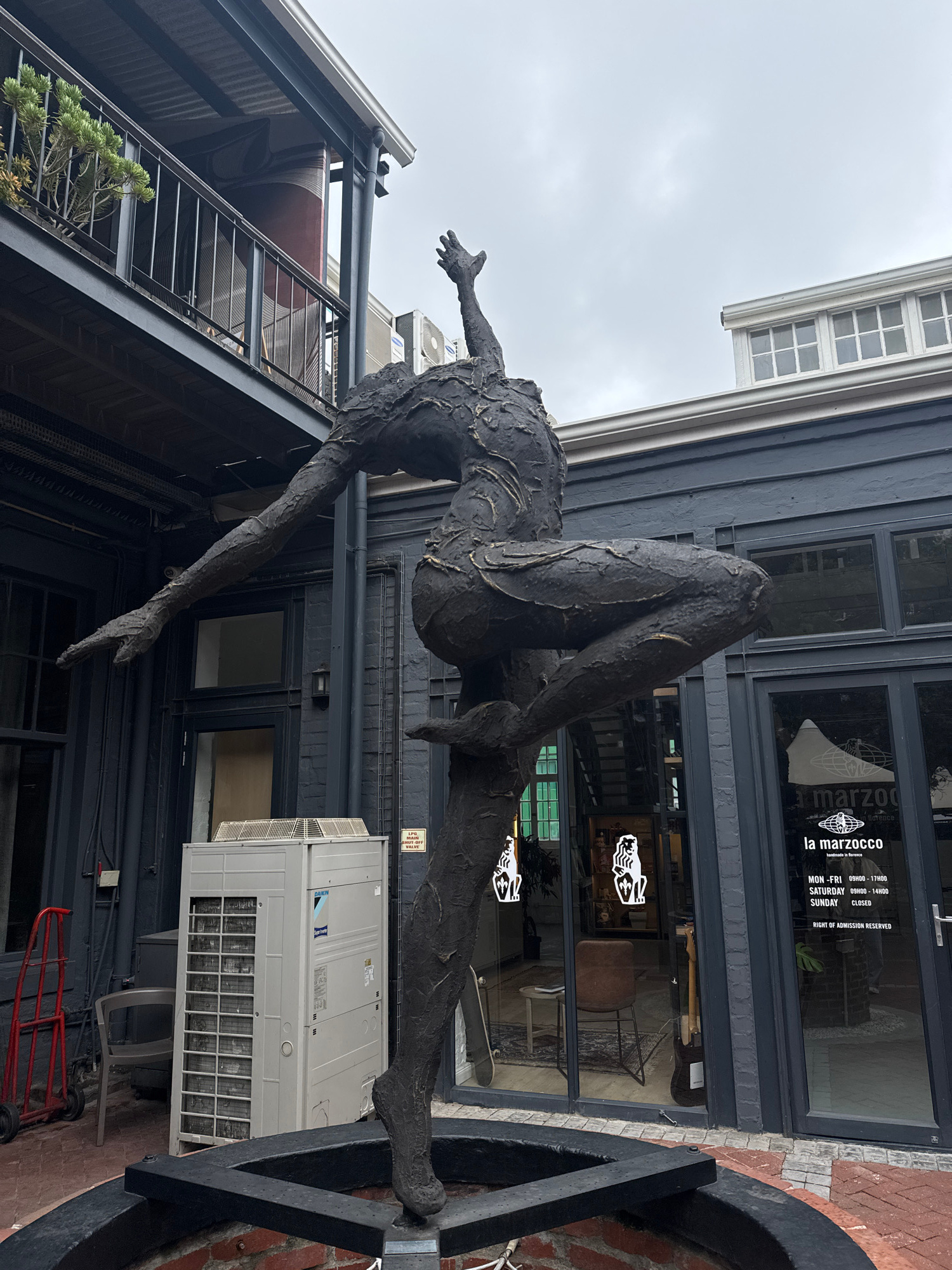 The image depicts a bronze sculpture of a human figure in an acrobatic pose. The sculpture is located outside a building with dark gray walls and windows. The building has a sign that reads "la marzoc…read more