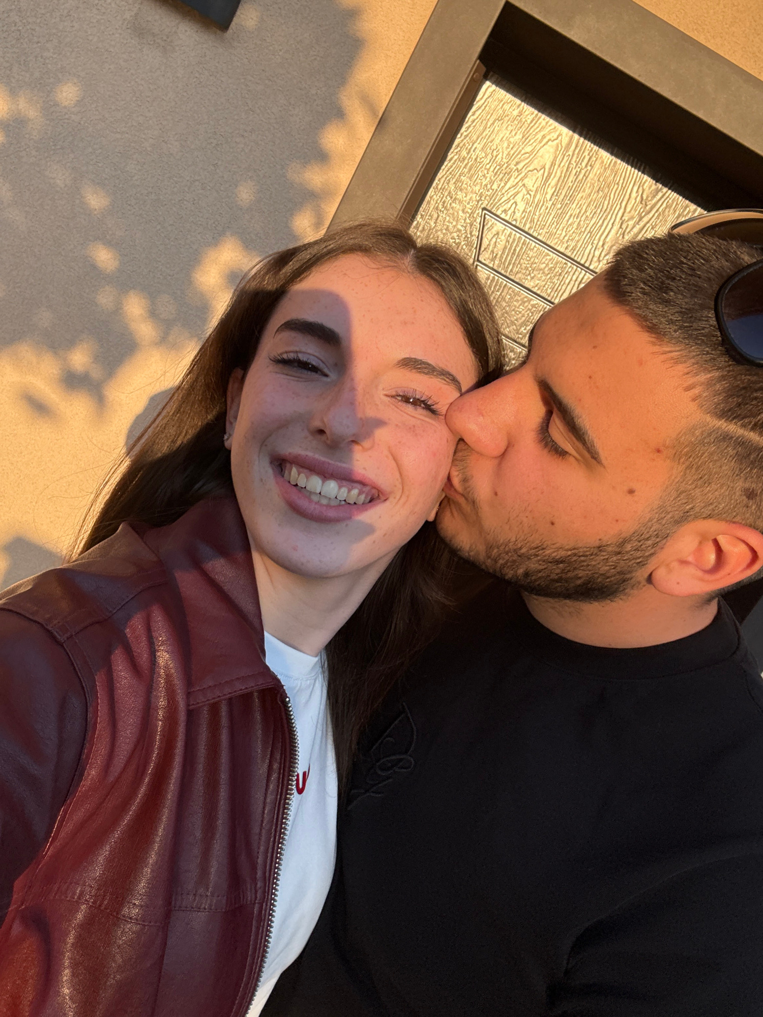 A medium-shot photograph captures a man kissing a woman on the forehead. The man has dark hair and a beard, and is wearing sunglasses on his head and a black shirt. The woman has long brown hair, frec…read more