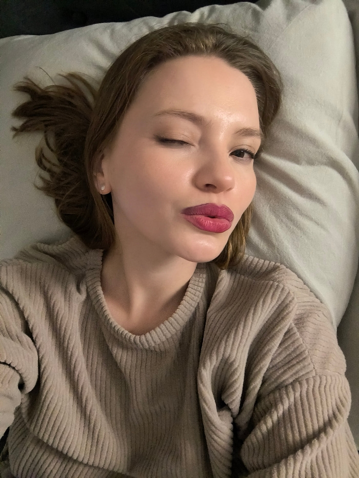 A woman winks, reclining against a pillow. Her light brown hair is tousled, and she wears a beige corduroy sweater. She sports a vibrant red-purple lipstick. A small, round earring is visible on her l…read more