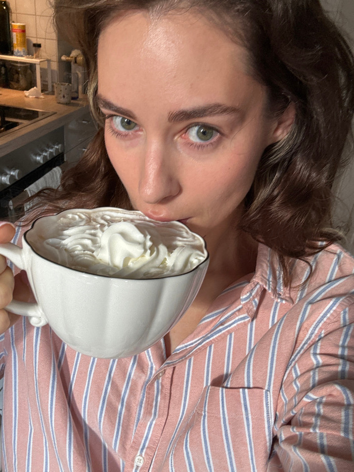 A female subject, approximately 20-35 years old, with brown wavy hair and green eyes, occupies the foreground, looking directly into the camera. She holds a white, fluted ceramic mug with a black rim,…read more