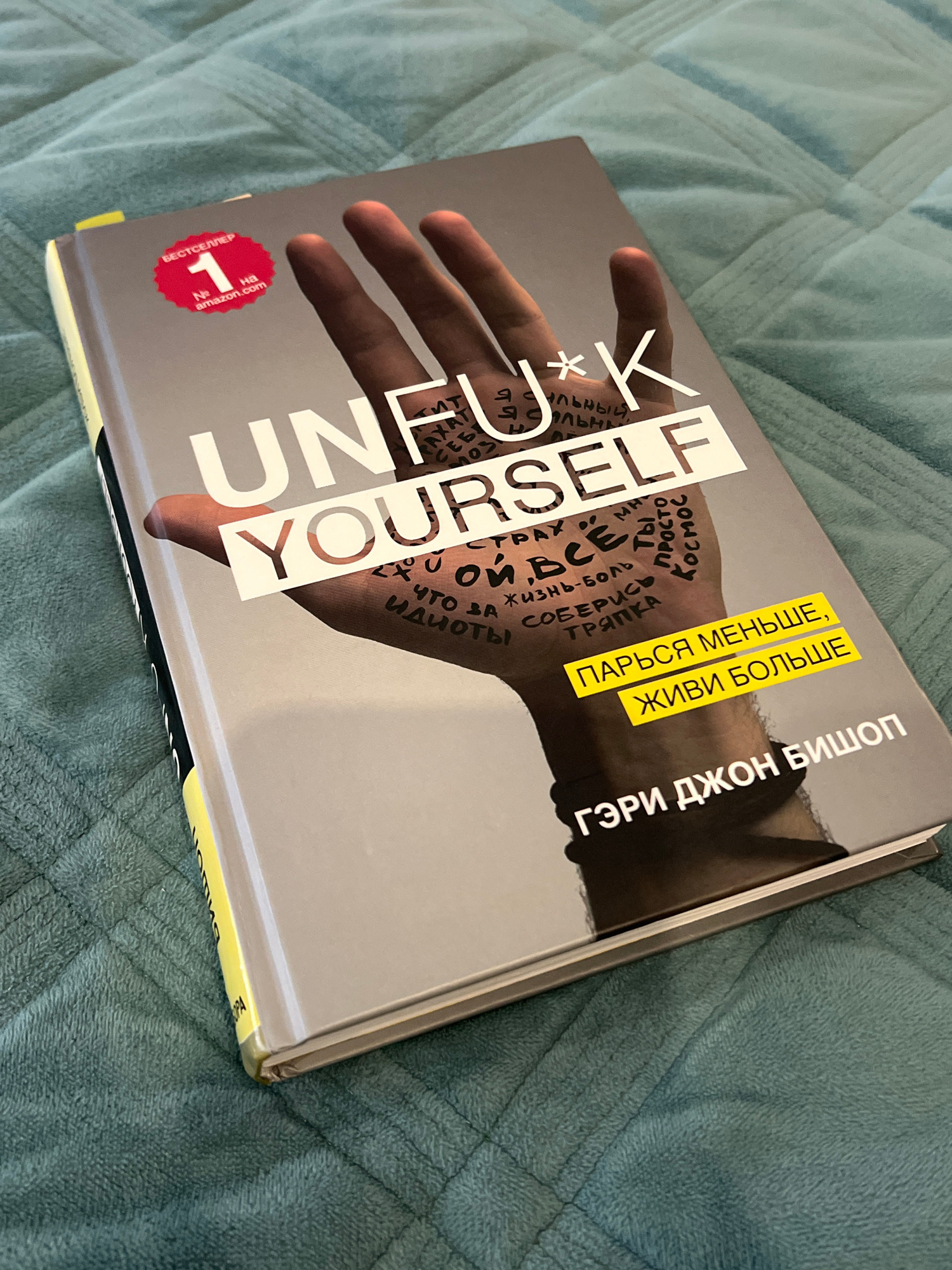 The image shows a Russian translation of the book "Unfu*k Yourself" by Gary John Bishop. The book is laying on a blue quilted surface. The cover is gray and features a hand with words written on it. T…read more