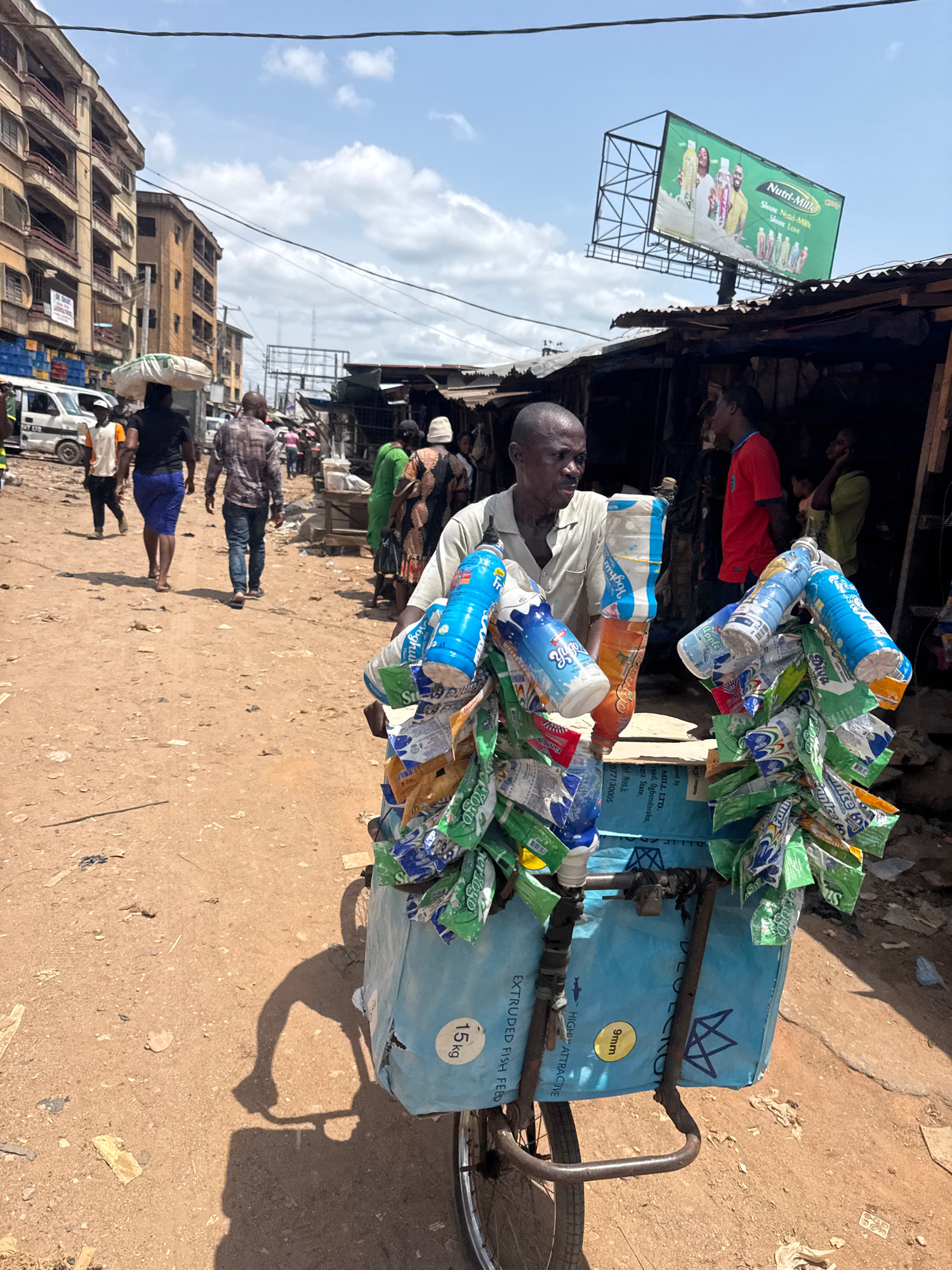 A man pushes a heavily loaded tricycle cart through a bustling street in Onitsha, Nigeria, under bright daylight. The scene depicts a vibrant market or commercial area with unpaved ground and building…read more