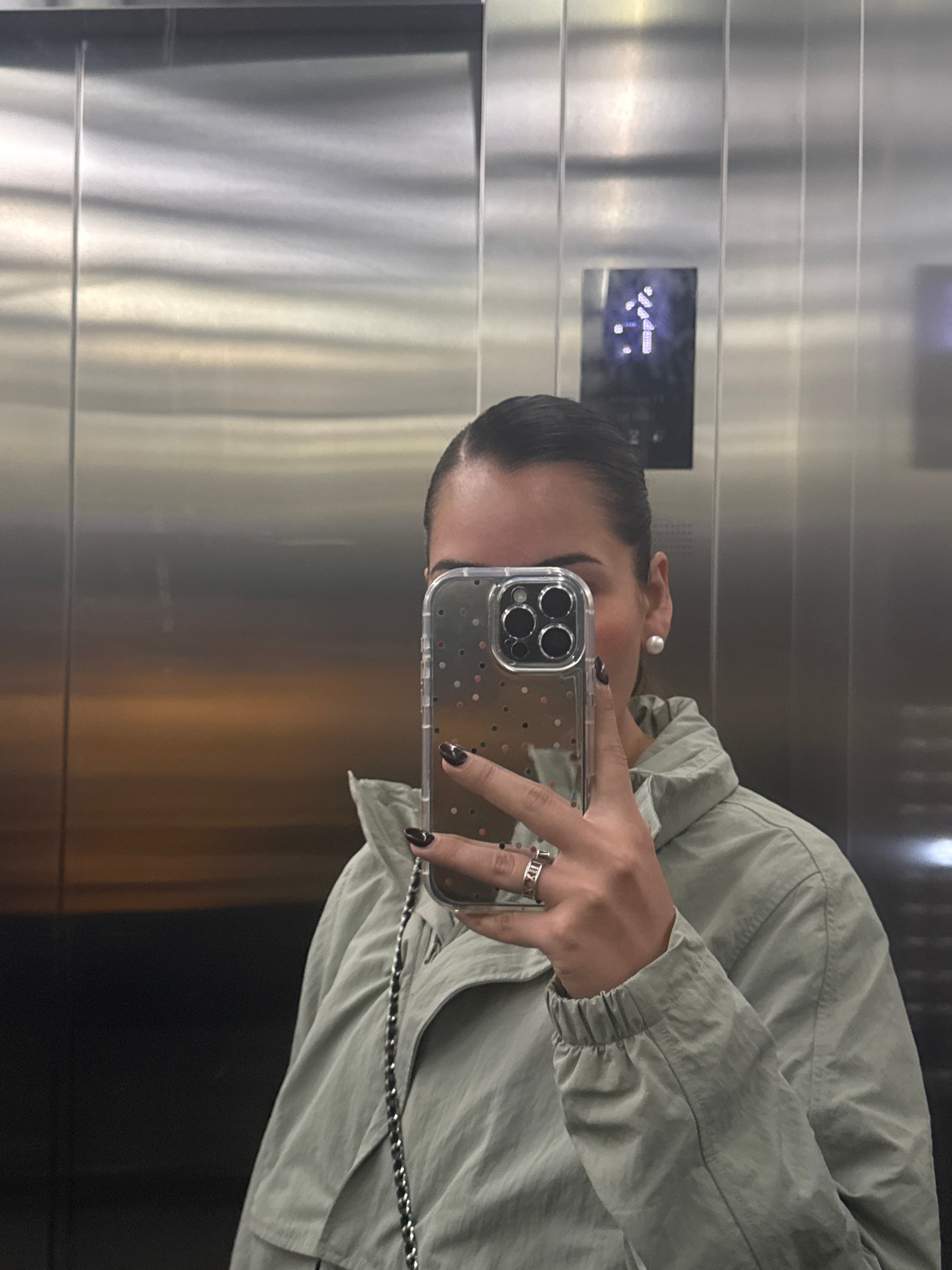 A person is seen taking a mirror selfie inside an elevator. The image is oriented vertically, showing the person from the chest up, holding a smartphone to capture their reflection. The individual, w…read more