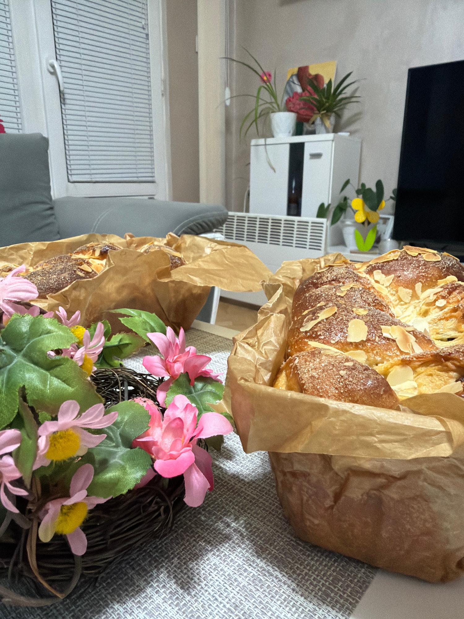 The image shows a loaf of bread topped with almonds in a brown paper bag, next to a floral wreath with pink and yellow flowers. The bread and wreath are resting on a gray textured surface. In the back…read more