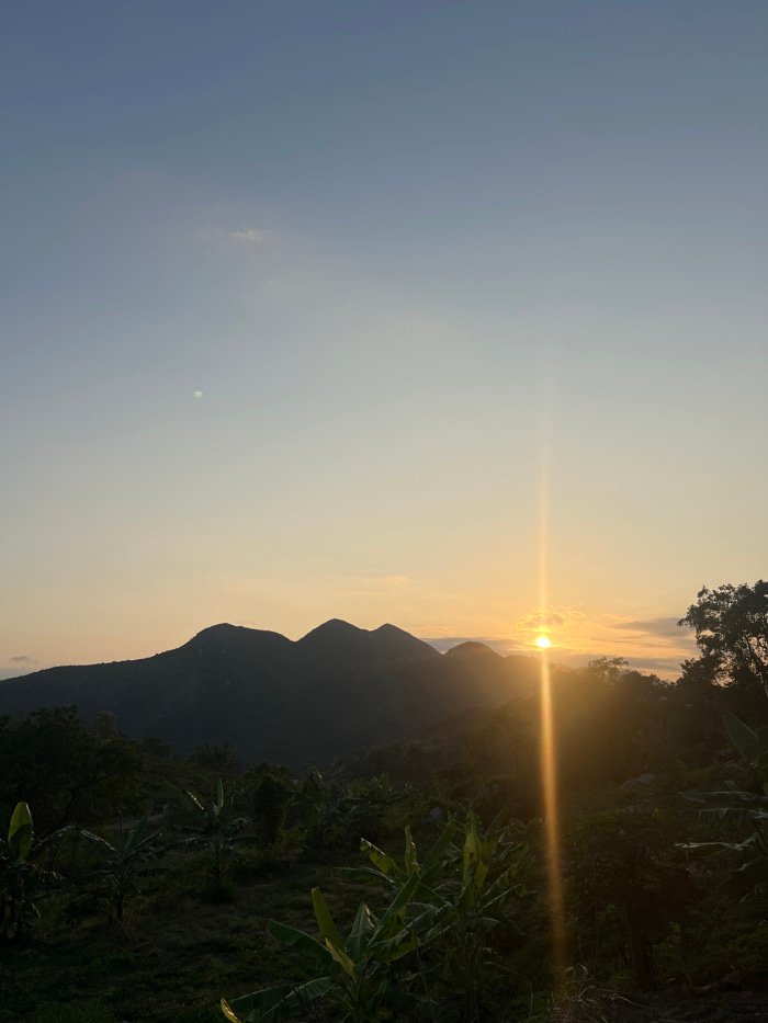 This is a landscape photograph captured at either sunrise or sunset over a mountainous, vegetated area within Nha Trang, Vietnam. The sky occupies the upper two-thirds, displaying a gradient from ligh…read more