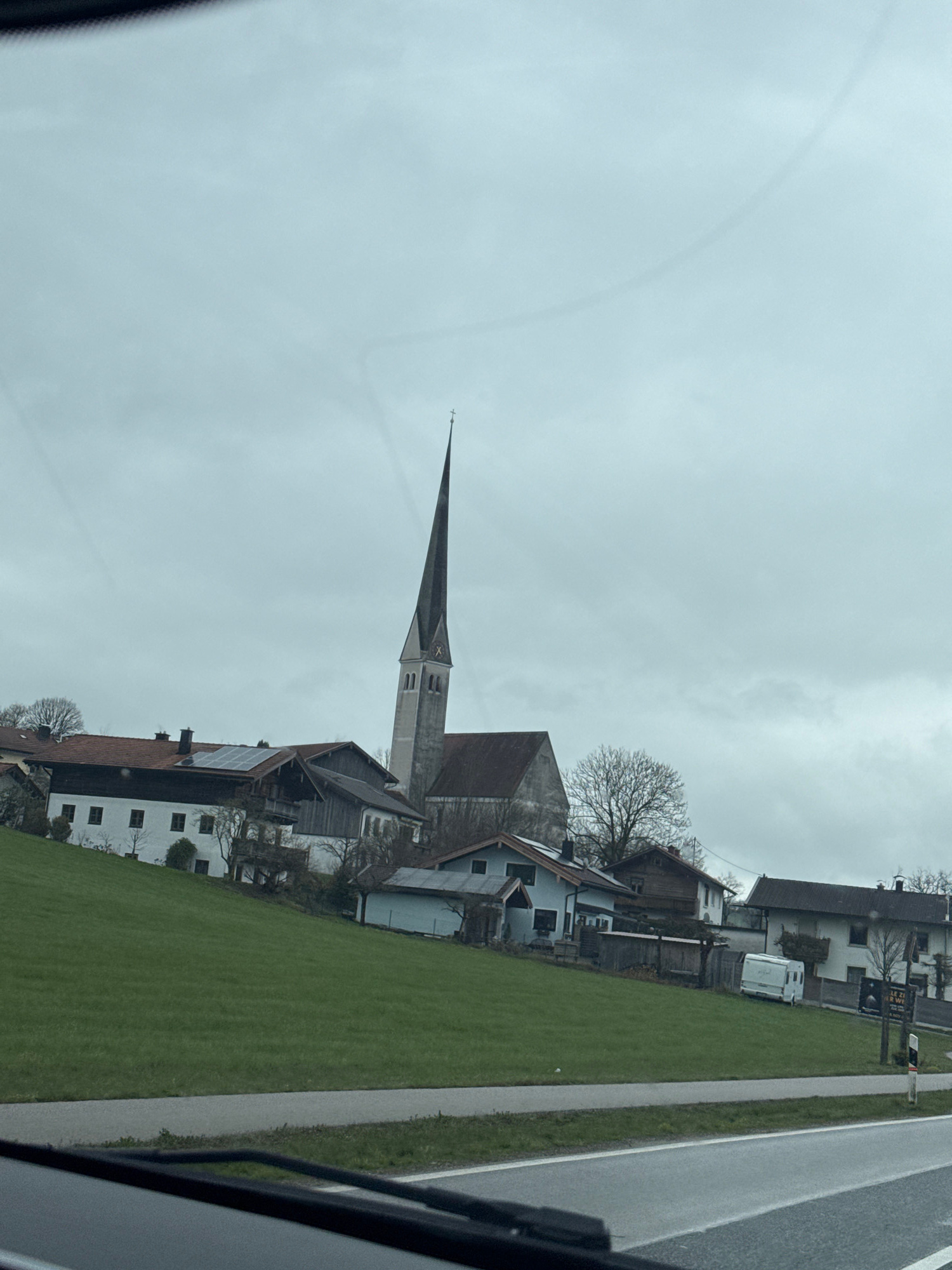The image shows a daytime view of Bad Endorf, Germany, featuring a church with a tall, pointed steeple. The camera is positioned at a low angle, possibly from inside a vehicle moving along a road, as…read more
