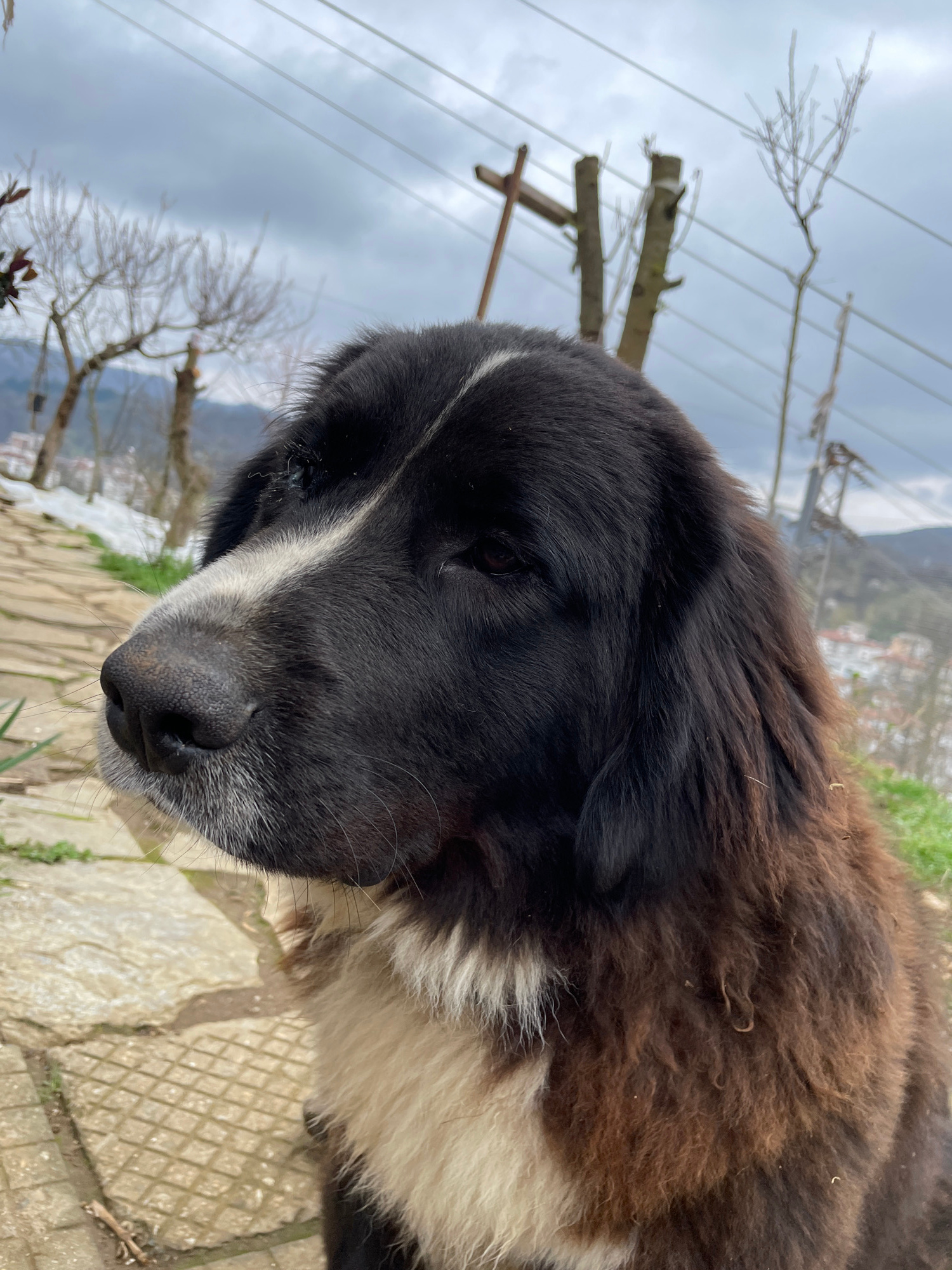 A close-up, slightly angled photograph shows a large, long-haired dog with black and brown fur, and a white stripe down its face. The dog is standing on a tiled surface. In the background, power lines…read more