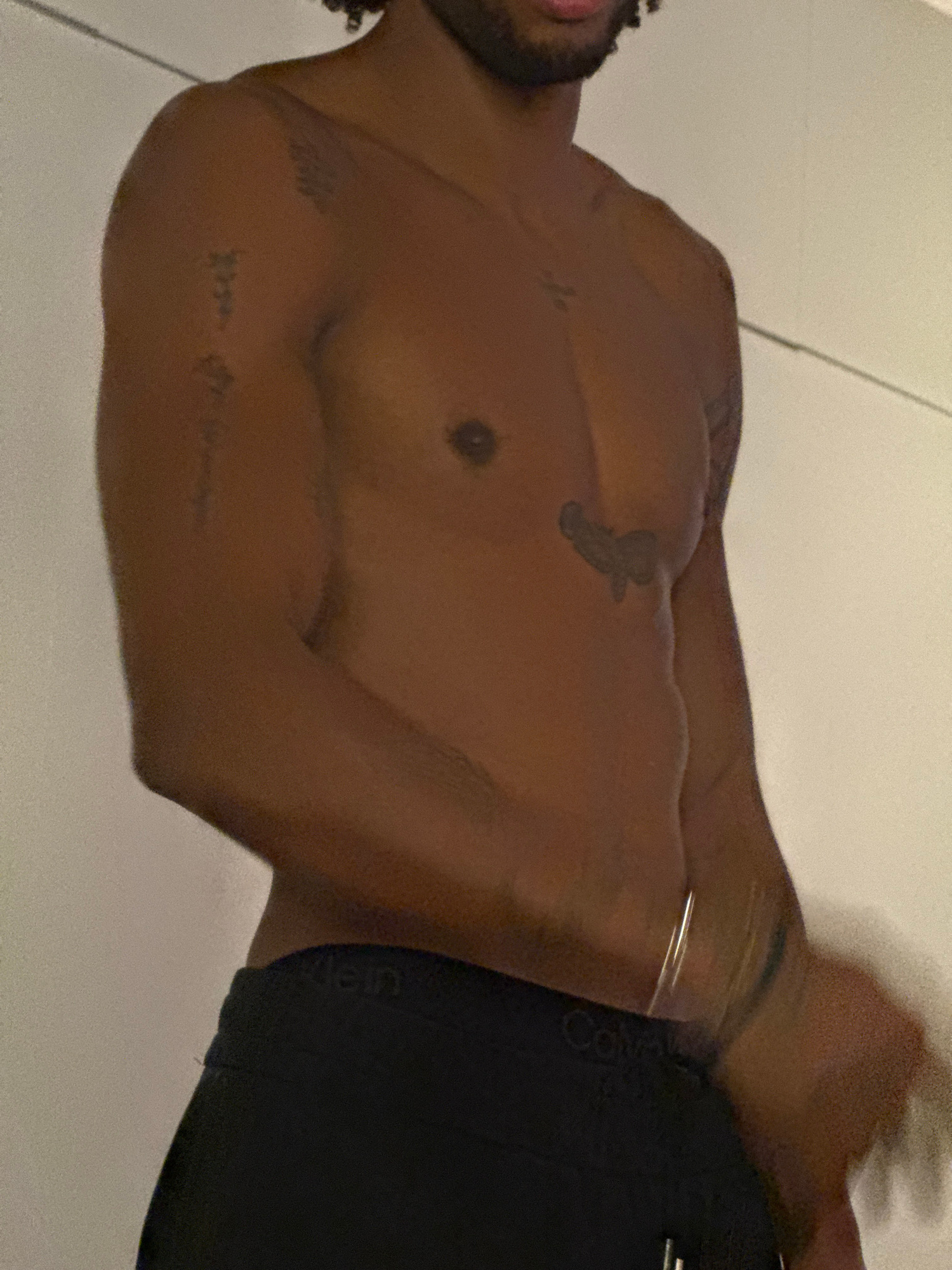 A shirtless man with brown skin is wearing black Calvin Klein underwear. He has tattoos on his chest and arm. He is standing on a white tile floor. The location is unknown, and there is no indication…read more
