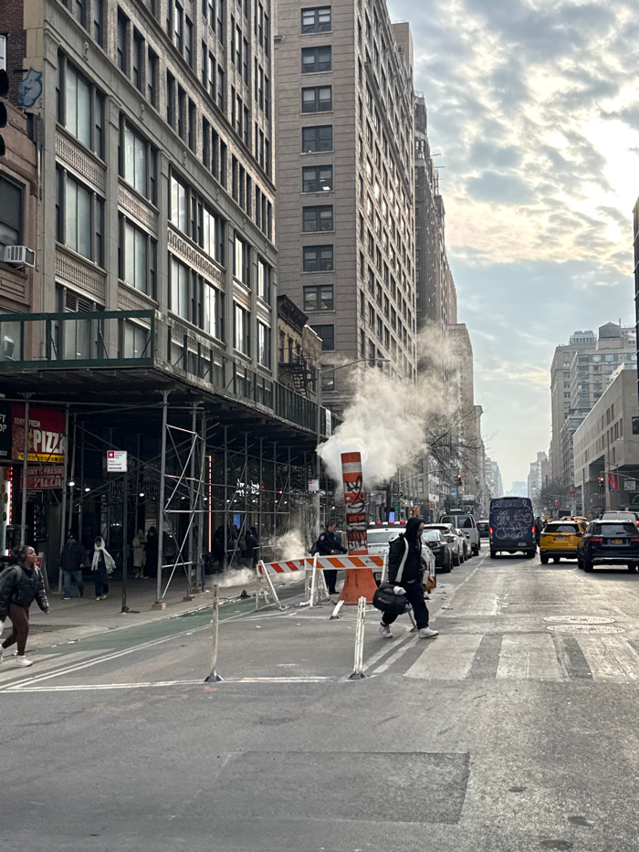 A city street scene features steam rising from a utility vent surrounded by orange and white traffic barriers. Scaffolding covers a building facade, while pedestrians walk below. Traffic is visible in…read more