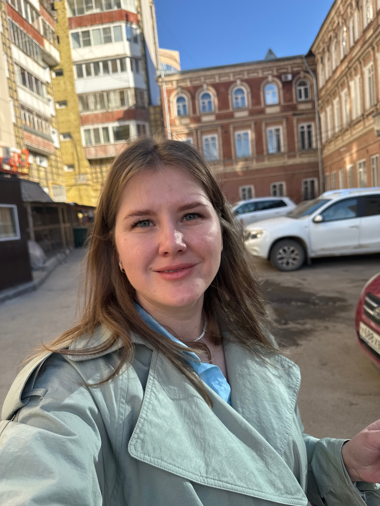 The image, rotated 90 degrees clockwise, captures a selfie of a young woman outdoors in an urban environment. The woman, likely in her 20s, has light brown hair, fair skin, and blue eyes, looking dire…read more