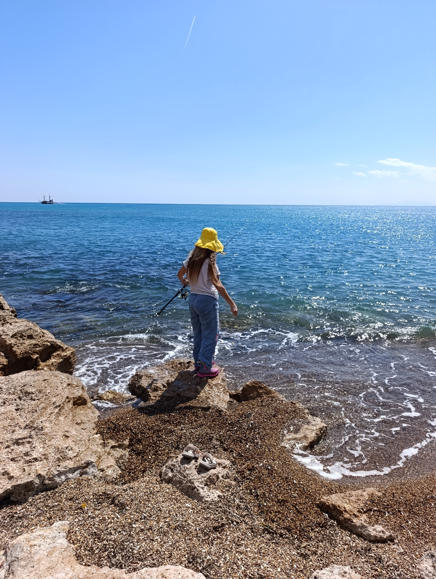 A young person wearing a yellow hat, white t-shirt, blue jeans, and pink boots is standing on a rocky outcrop at the edge of the Mediterranean Sea. They are holding a fishing rod and facing the water.…read more