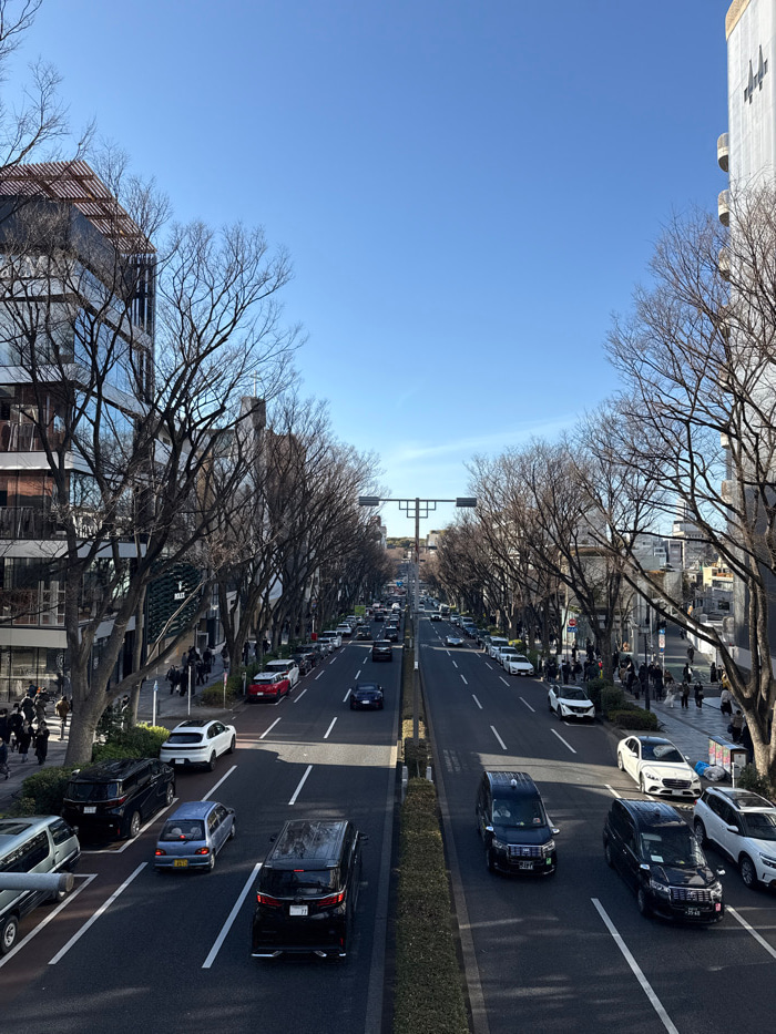 A street view showcases a straight road lined with bare trees on both sides. Cars fill the lanes, moving towards the distance. Pedestrians walk along the sidewalks next to the trees. Buildings of vary…read more