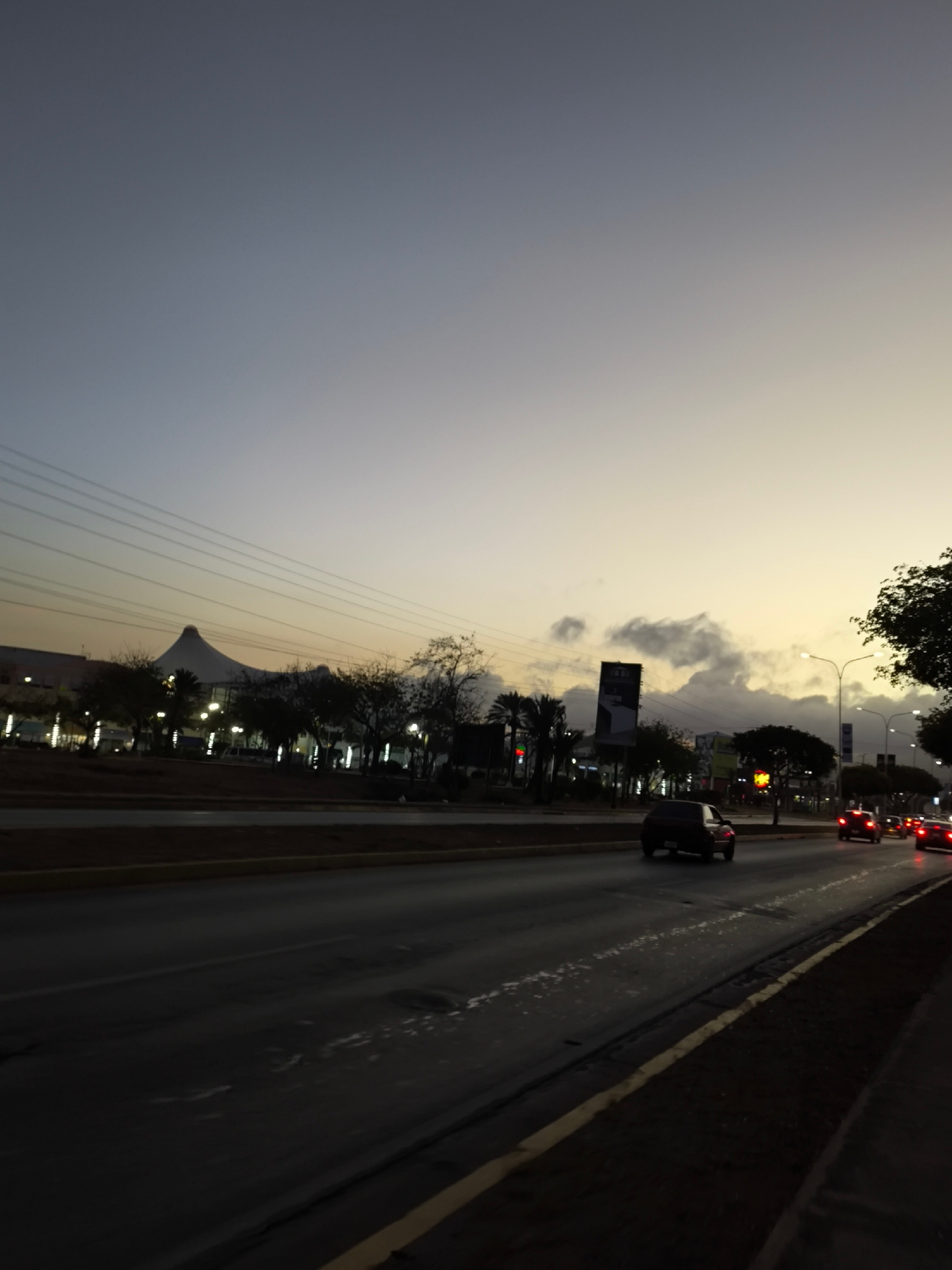 The image depicts a street scene in Pampatar, Venezuela, during dusk or dawn. The sky transitions from gray to pale yellow. A multi-lane road stretches into the distance with moderate traffic, includiβ¦read more