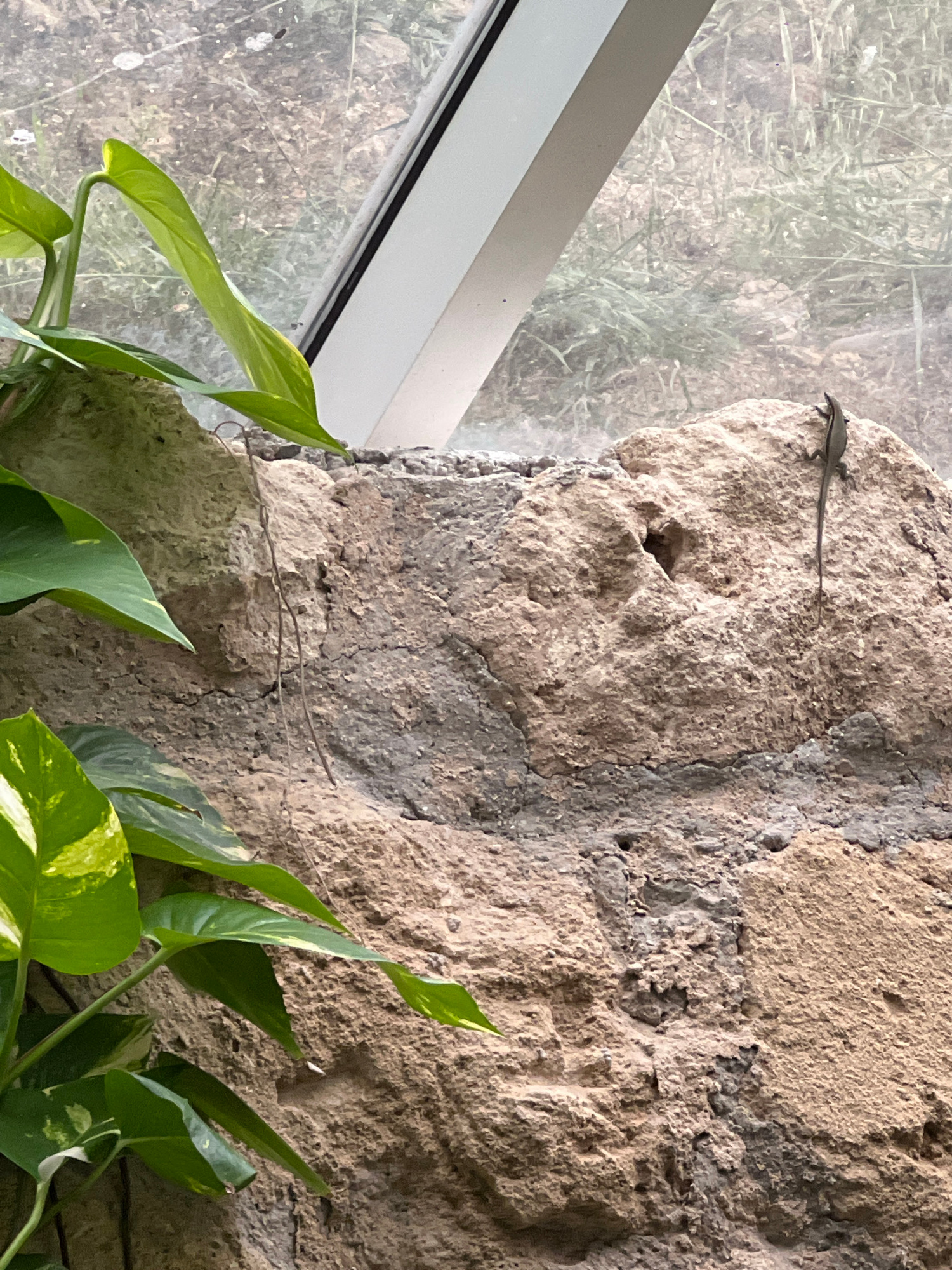 The image presents a close-up view of a small lizard, a textured wall, a window, and a plant. A slender, dark-colored lizard, approximately 10-15 cm in length including its long tail, is positioned on…read more