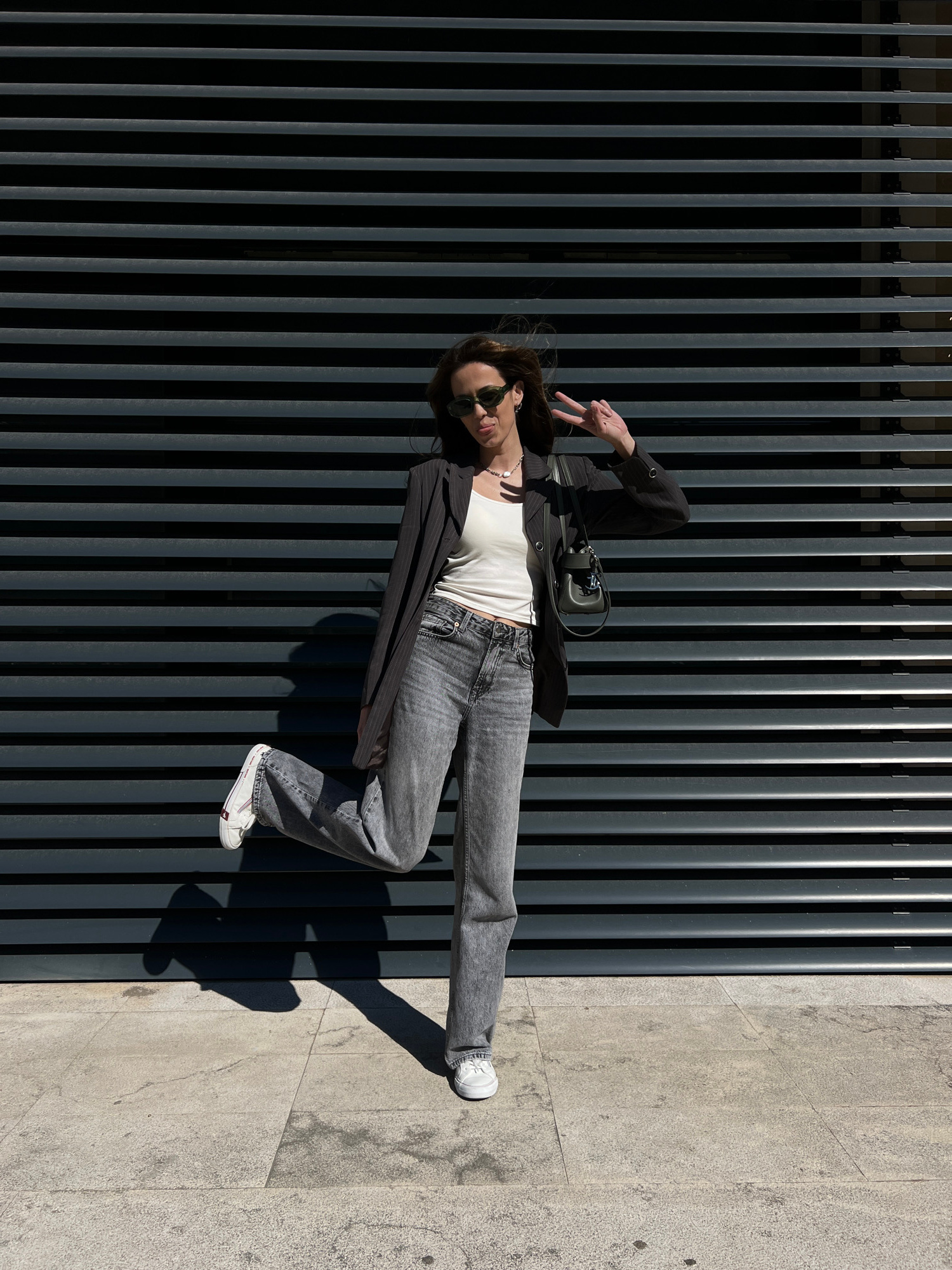 A woman is posing for a photograph against a slatted wall in Bar, Montenegro. The woman is wearing a black blazer, a white tank top, grey jeans, and white sneakers. She has sunglasses on. Her head is…read more