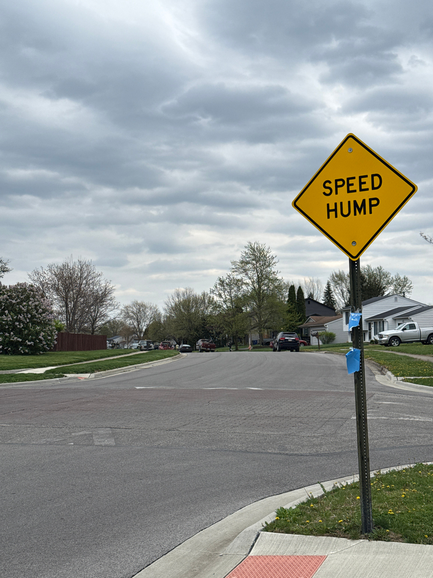 The image shows a yellow diamond-shaped "SPEED HUMP" sign on a metal pole beside a street in a residential area. The road curves slightly to the right, with grass and dandelions growing along the edge…read more