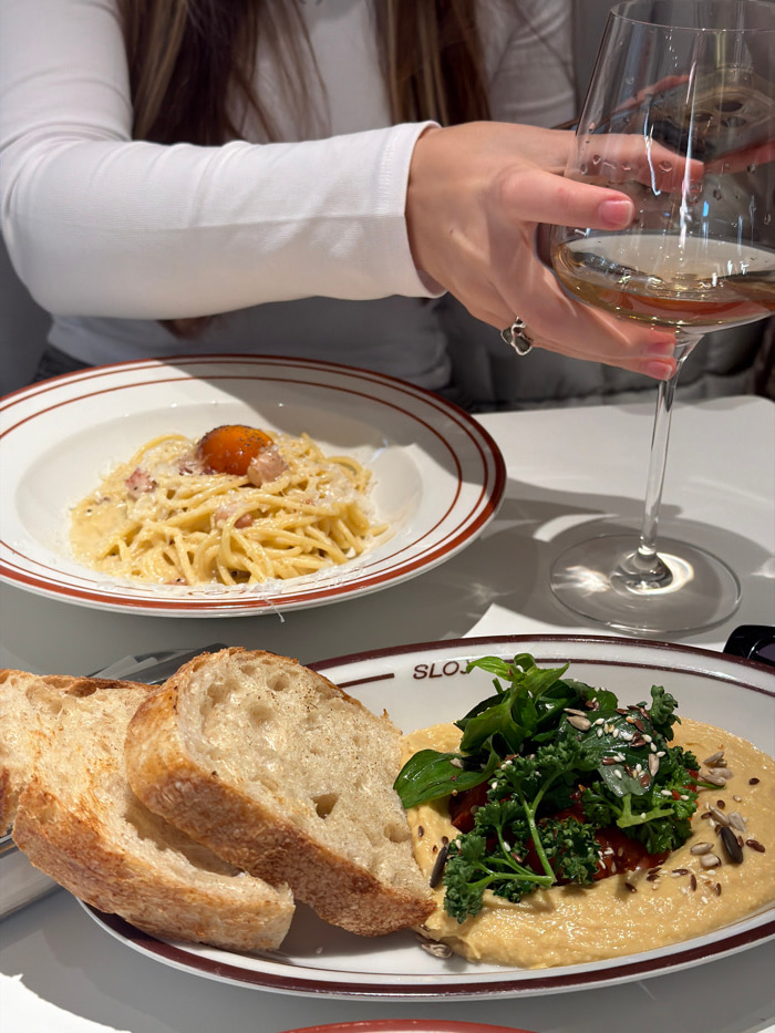 This image depicts an indoor dining scene at Sloja restaurant, located at Sremska 9, Belgrade, Serbia. A person is visible from the chest up, wearing a white long-sleeved top, with long light brown ha…read more