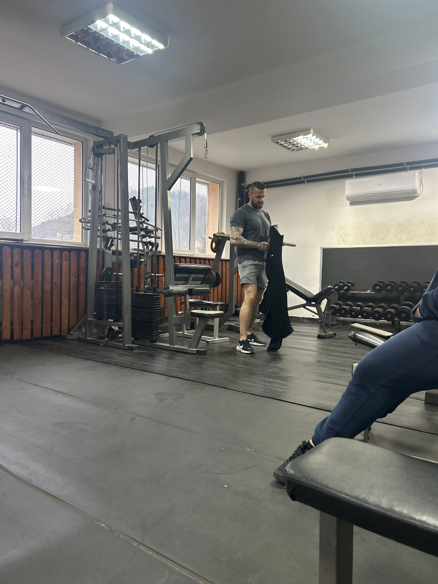 **Location:** Gym in Zlatograd, Bulgaria. **Environment:** The gym has a dark rubber floor, white walls, and fluorescent lighting. There are several windows with metal mesh coverings over them with a…read more