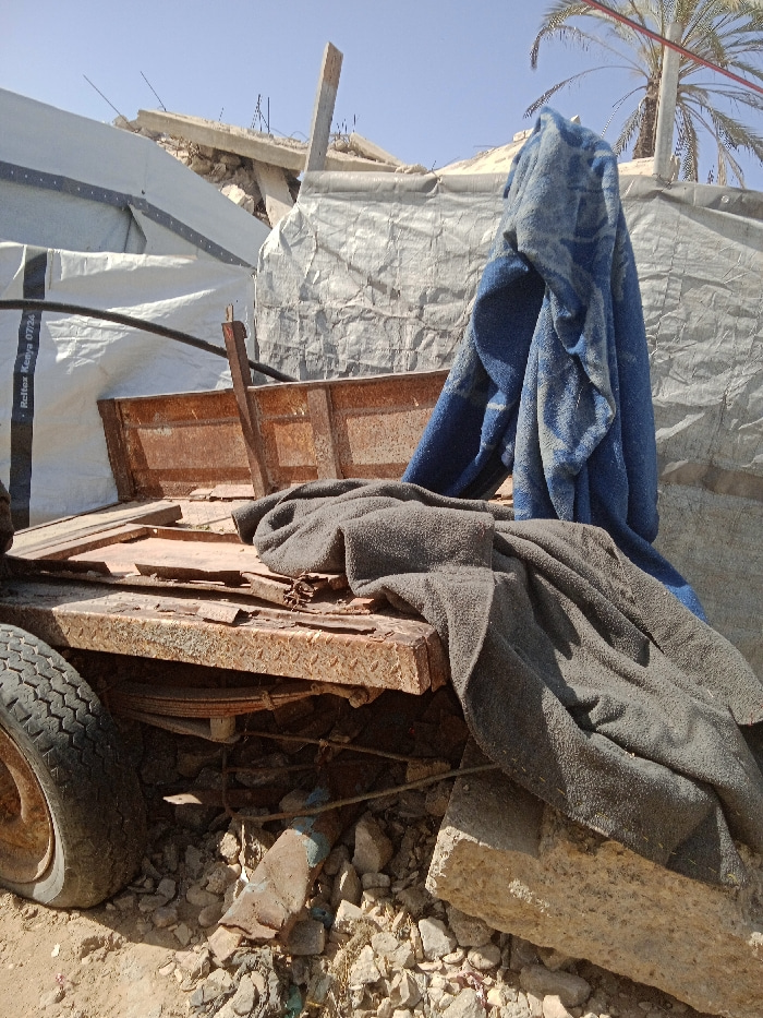The image depicts a static outdoor scene in Khan Yunis, Palestinian Territory, characterized by makeshift structures and debris under clear daylight. In the foreground, the lower-left corner reveals a…read more