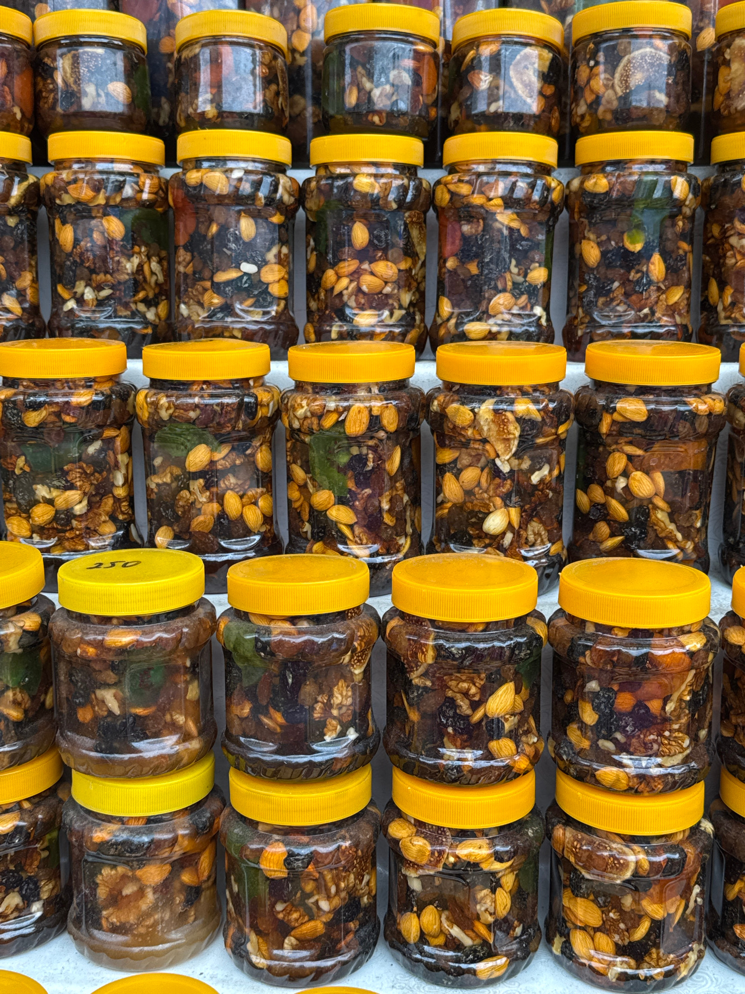 The image displays an overhead, close-up view of numerous transparent plastic jars, each filled with a dense mixture of nuts and dried fruits suspended in a dark, viscous liquid, likely honey or syrup…read more