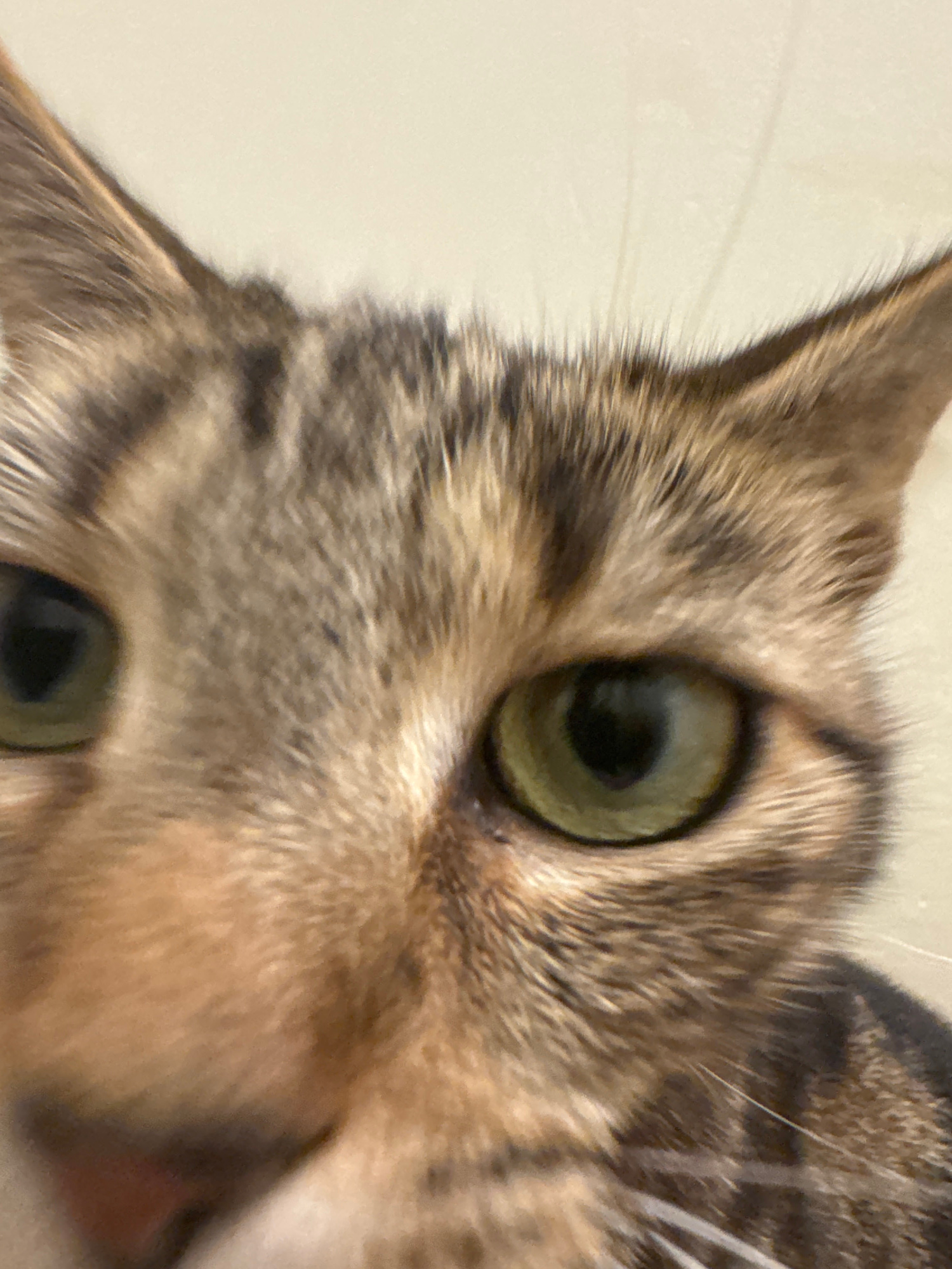 The image is a close-up of a tabby cat's face. The cat has green eyes and brown and grey fur. The cat's ear is visible in the top left corner of the image. The cat's whiskers are also visible. The bac…read more