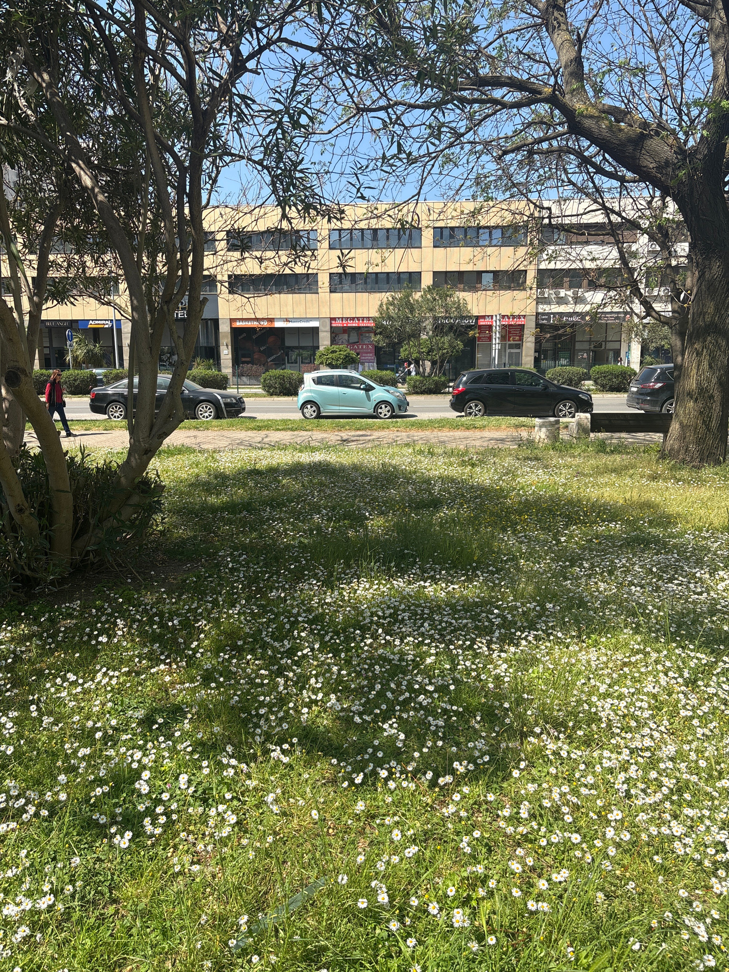 This media file captures a vibrant outdoor street scene in Bar, Montenegro, under bright sunlight. The image is oriented vertically, showcasing a bustling urban environment juxtaposed with natural ele…read more