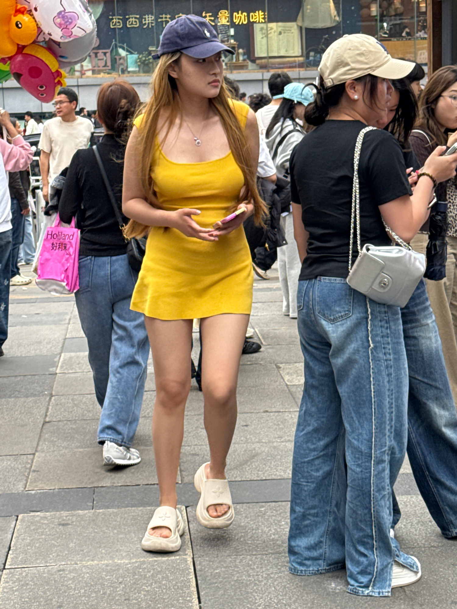 The image captures a street scene in Liangjiang, China. The foreground features a young woman wearing a yellow mini dress and a blue baseball cap. She is holding a smartphone. Behind her is a group of…read more