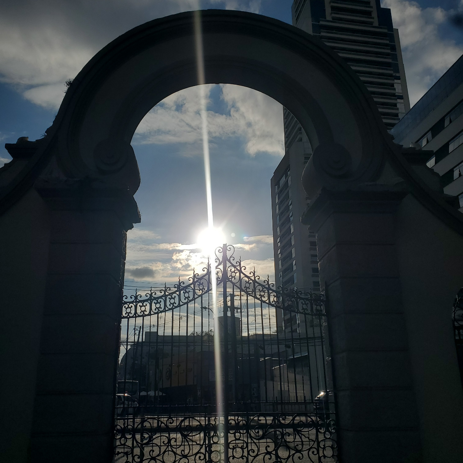 The image displays an urban architectural scene captured from a low angle, looking upwards towards the sky. In the foreground, a large, dark, ornate archway or stone structure forms a significant silh…read more