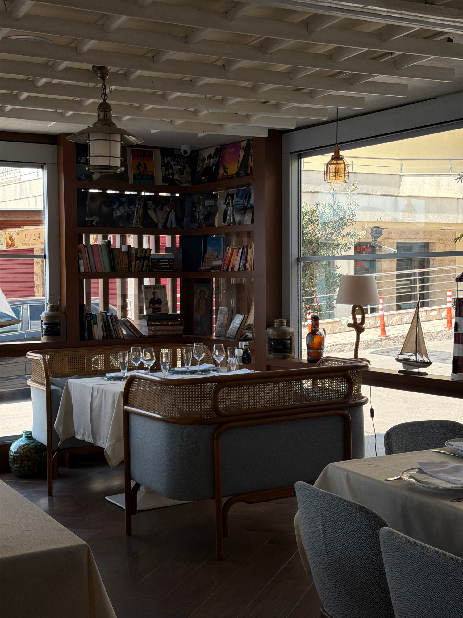 The image shows the interior of a restaurant, likely in Rafailovići, Montenegro, given the location tag. The restaurant features a floor-to-ceiling bookshelf filled with books and various decorative o…read more
