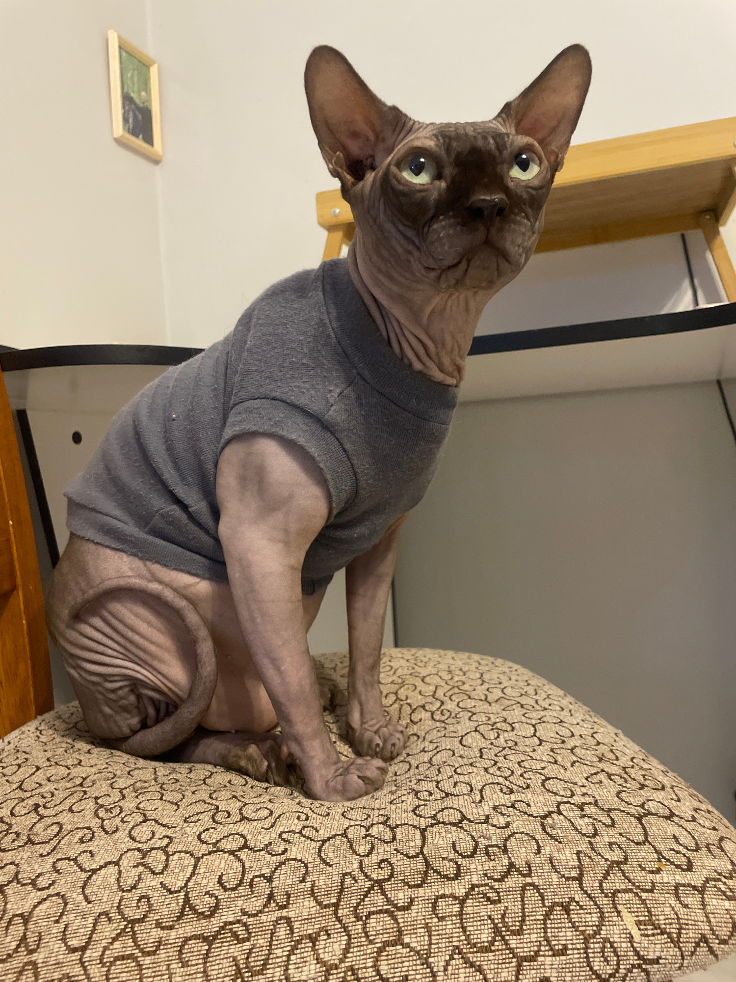 A hairless cat wearing a gray shirt is seated on a patterned chair. The cat is looking towards the camera. A picture frame is visible on the wall in the background. The location is Unknown, Unknown.
