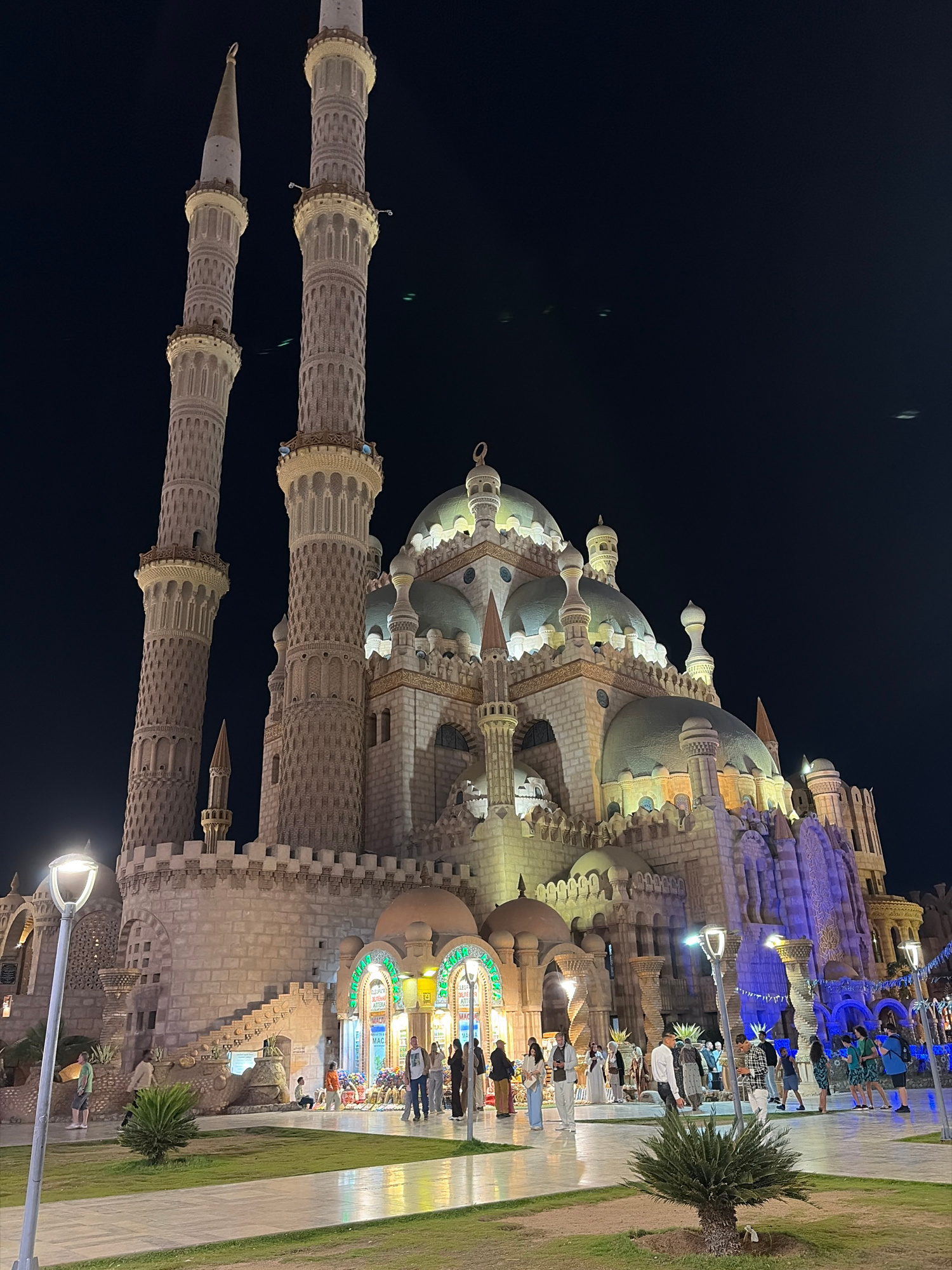 The image depicts the Al Sahaba Mosque in Sharm El Sheikh, Egypt, at night. The mosque is a large, elaborate stone structure illuminated by artificial lights, rendering the sky a deep black. Two tall,…read more