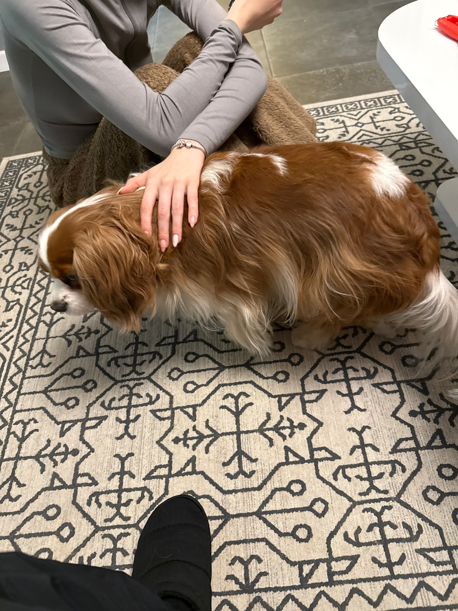 A high-angle shot depicts a Cavalier King Charles Spaniel being petted by a person wearing a gray long-sleeve shirt. The dog is primarily brown and white. The person's hand is on the dog's head. Theyβ¦read more