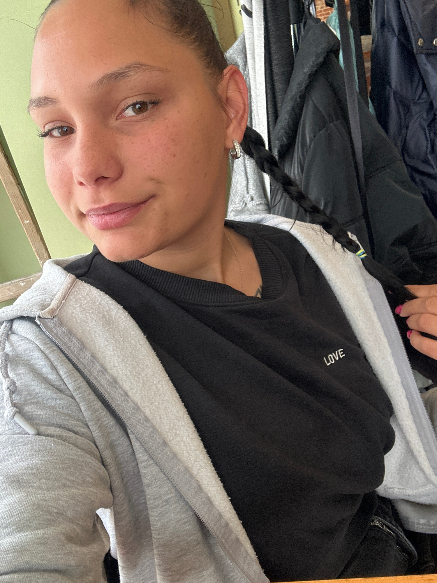 A woman with brown eyes, freckles, and a braid is wearing a black sweatshirt with the word "LOVE" on the sleeve and a gray zippered hoodie. She is standing indoors in front of a clothing rack with jac…read more