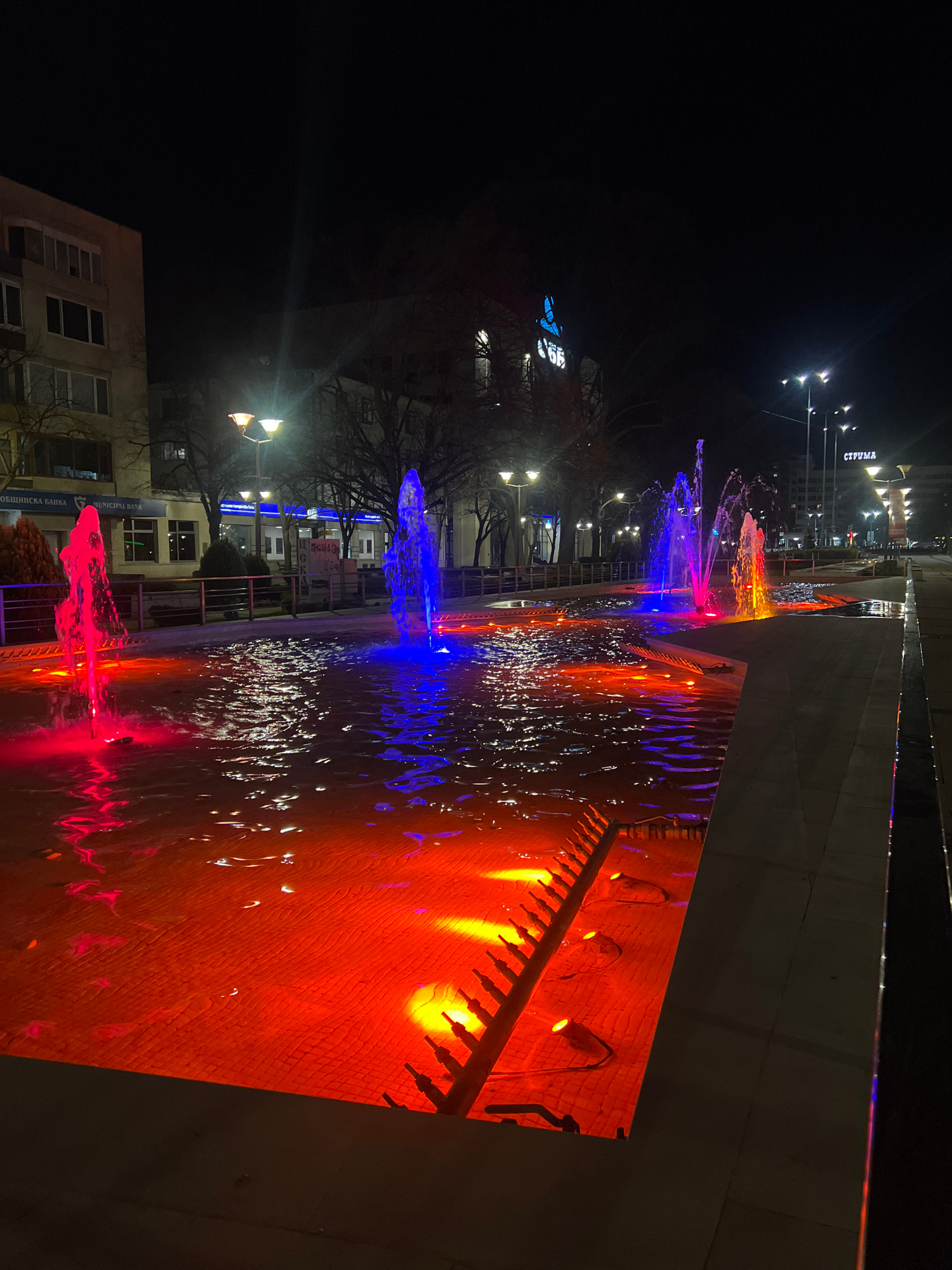 The image captures a nighttime scene in Pernik, Bulgaria, featuring a fountain illuminated by colored lights. The water is dyed in shades of red, orange, and blue, creating a vibrant display. In the b…read more