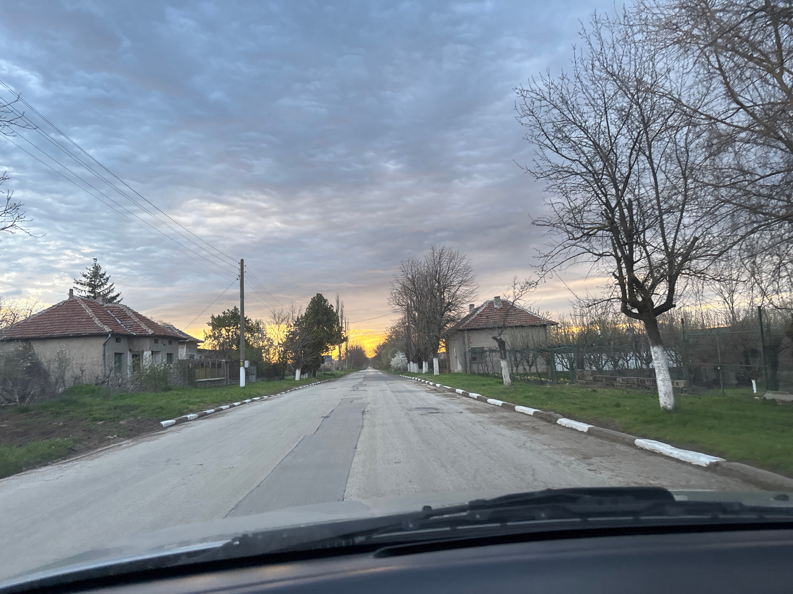 The image depicts a view from inside a vehicle driving down a rural road in Lepitsa, Bulgaria. The road is asphalt, showing signs of wear and repair. Both sides of the road are lined with curb stones…read more