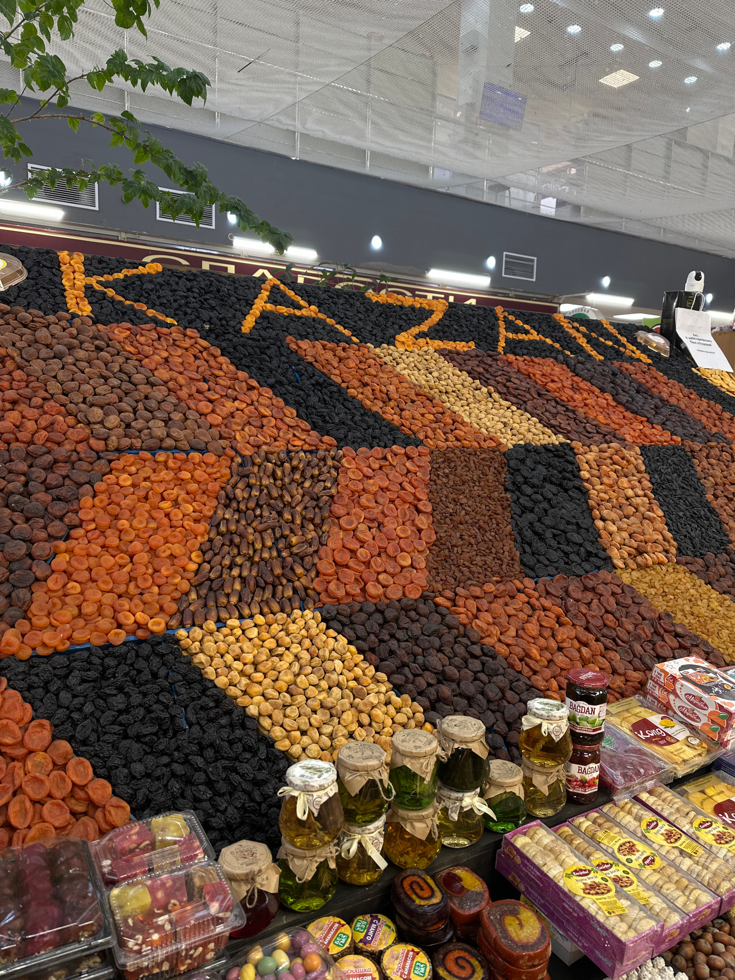 The image shows a display of dried fruits and other confectionery items in a market, likely in Kazan, Russia. The dried fruits, primarily apricots and prunes, are arranged in colorful patterns. The pr…read more
