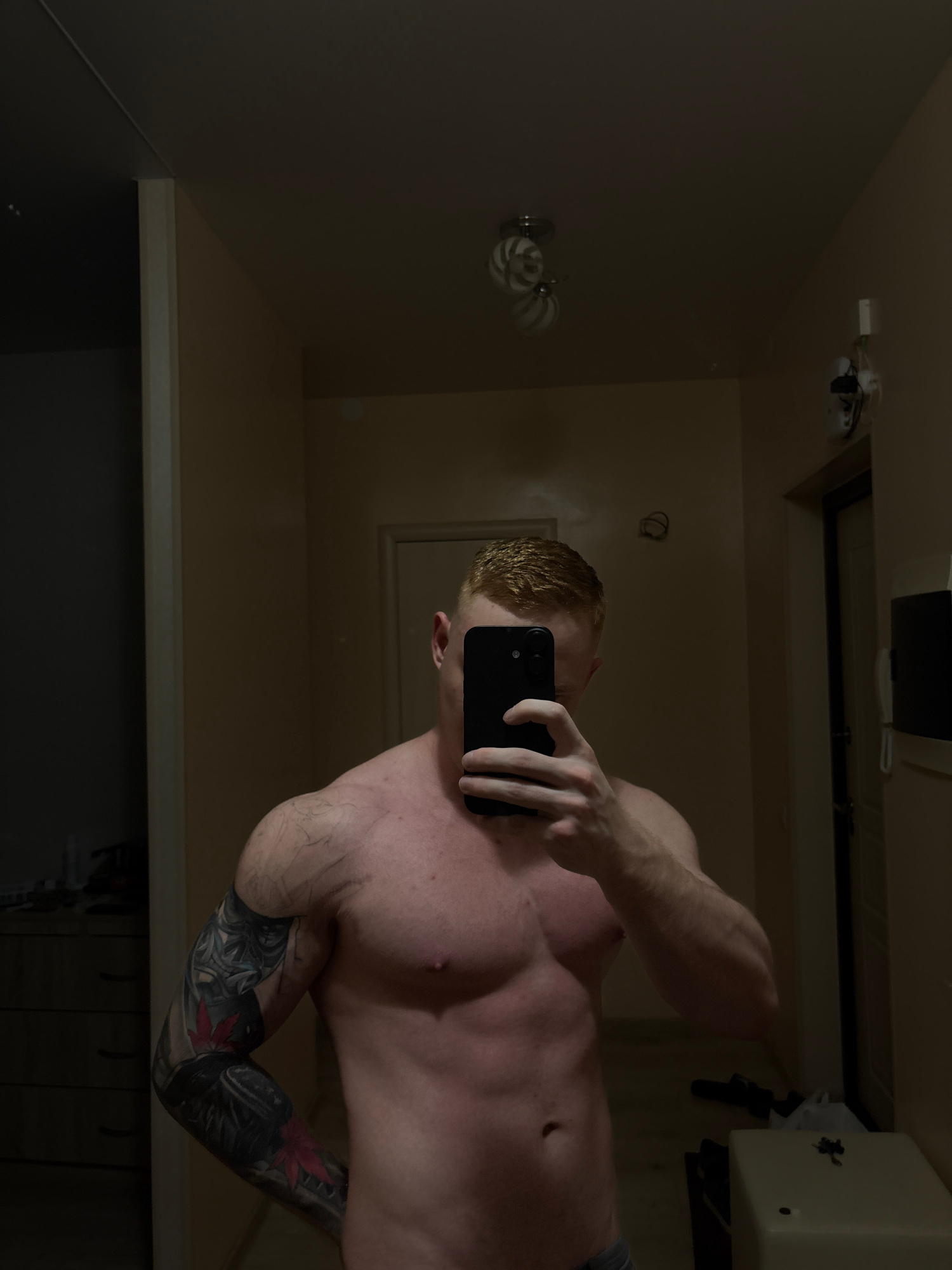 The image shows a shirtless man with fair skin and short, ginger hair taking a selfie in a bathroom mirror. He is holding a black smartphone. The man has tattoos on his left arm. The bathroom has a li…read more