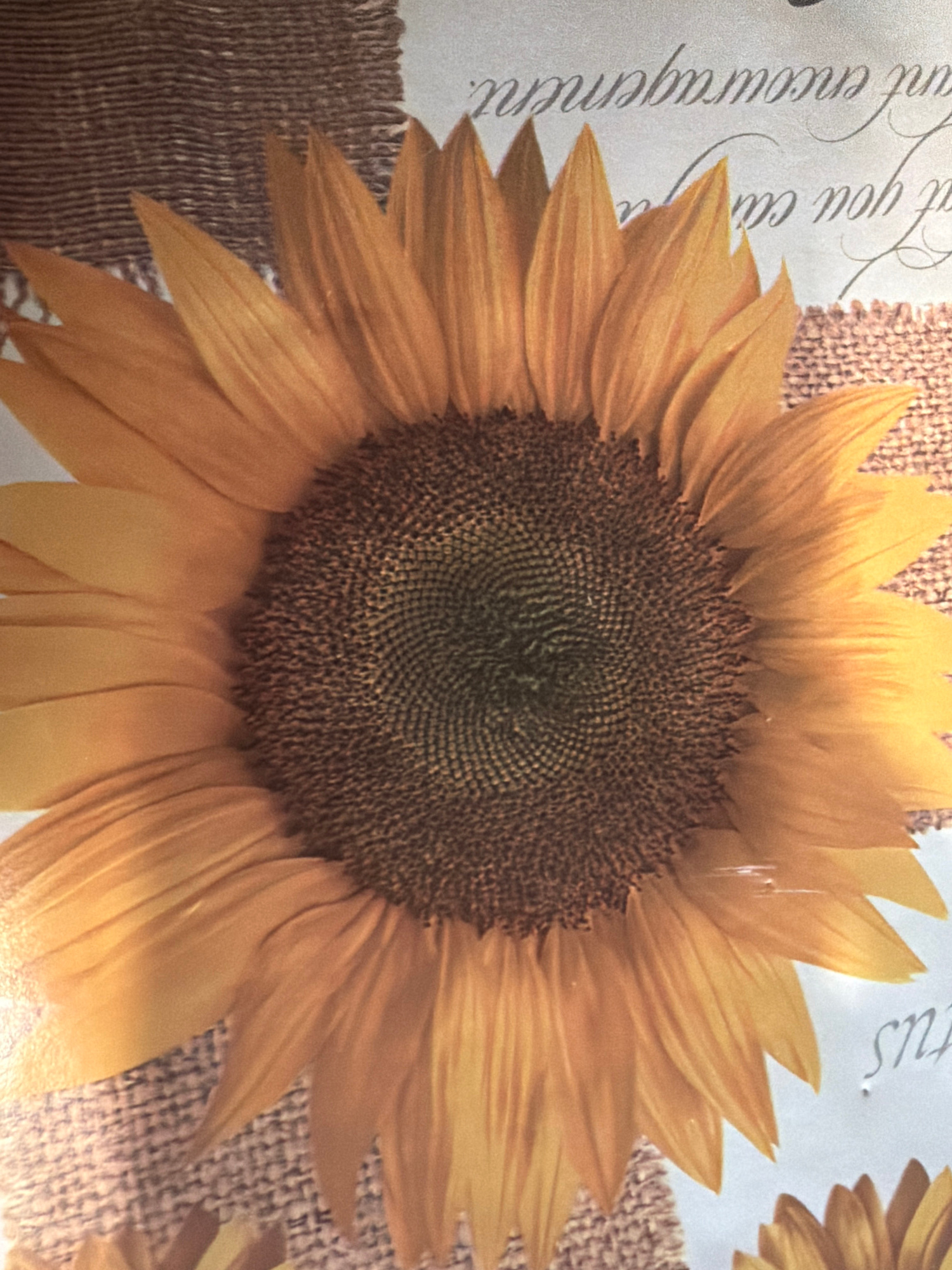 The media file features a large, vibrant sunflower centered on a decorative surface. Its numerous bright yellow petals radiate from a dark brown central disk, which displays the characteristic spiral…read more