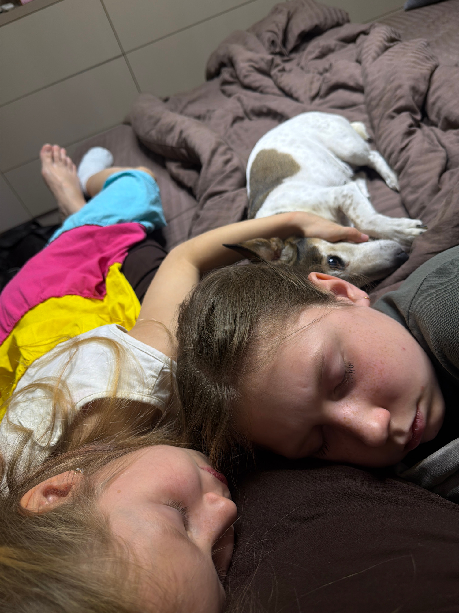 A slightly elevated, close-up shot shows a young adult lying on a bed with a child and a dog. The young adult is on their side, facing left, with their eyes closed. They are wearing a dark-colored top…read more