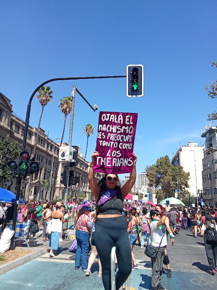 The image depicts a crowded street scene under a clear blue sky, indicative of a large public gathering or protest. The central figure is a woman, appearing to be in her late 20s to early 30s, standin…read more