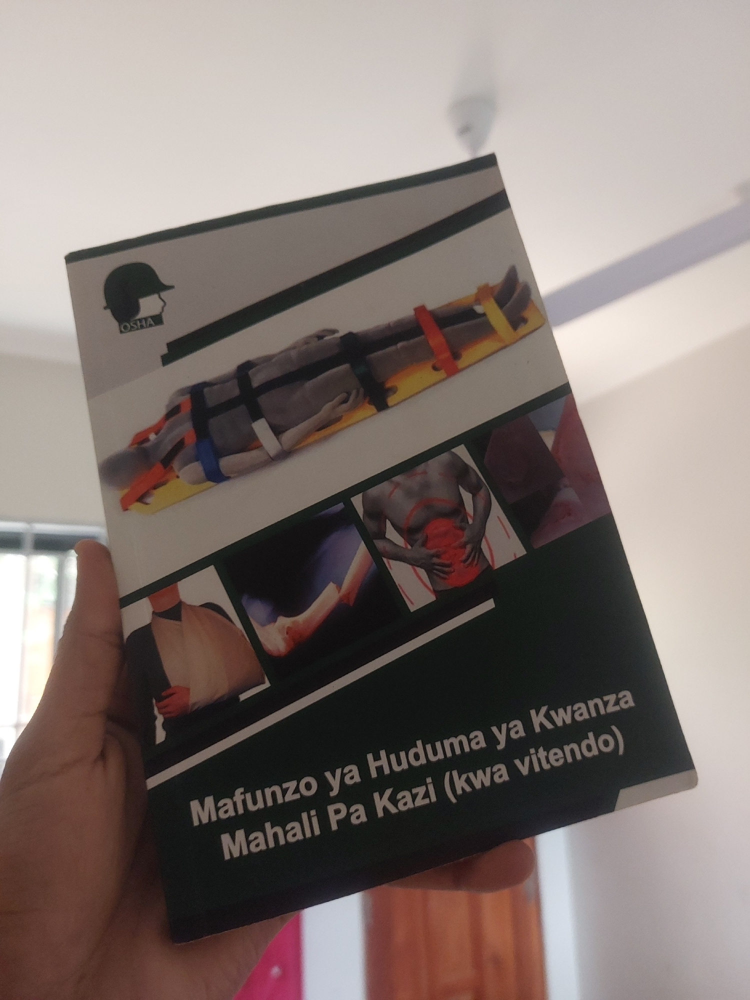A person holds a book in their hand. The book is titled "Mafunzo ya Huduma ya Kwanza Mahali Pa Kazi (kwa vitendo)" which translates to "First Aid Training in the Workplace (in practice)." The cover fe…read more