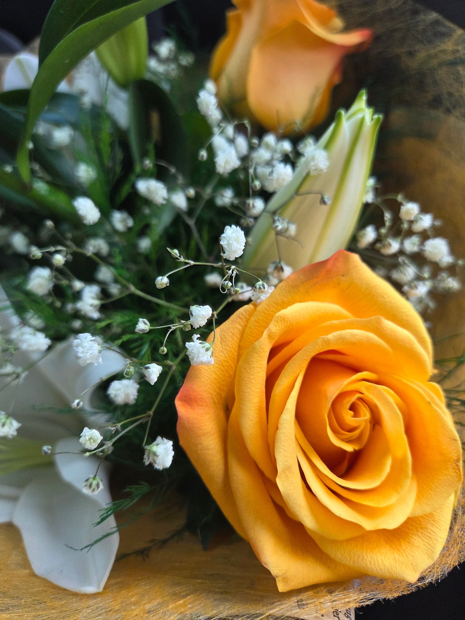 A close-up shot of a bouquet of flowers, dominated by a golden-yellow rose in full bloom. Flanking the rose are sprigs of delicate white baby's breath flowers. A white lily and another rose of similar…read more