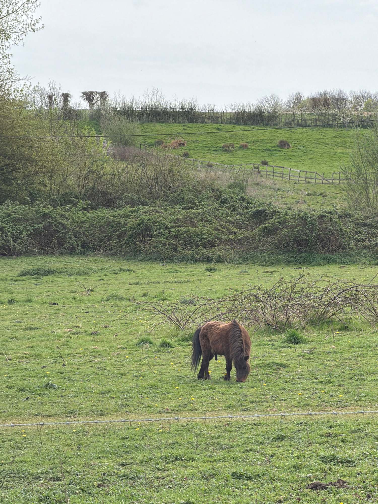 A brown pony is grazing in a green field. The field is bordered by trees and shrubs. In the background, there is a fence and more green fields. The sky is overcast. The location is likely a rural areaβ¦read more