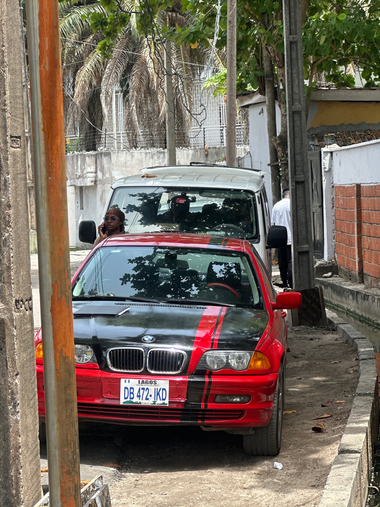 The image captures a street scene in Lagos, Nigeria, featuring a red and black BMW parked adjacent to a white van. A person is visible inside the van, appearing to be on a mobile phone. The car's liceβ¦read more