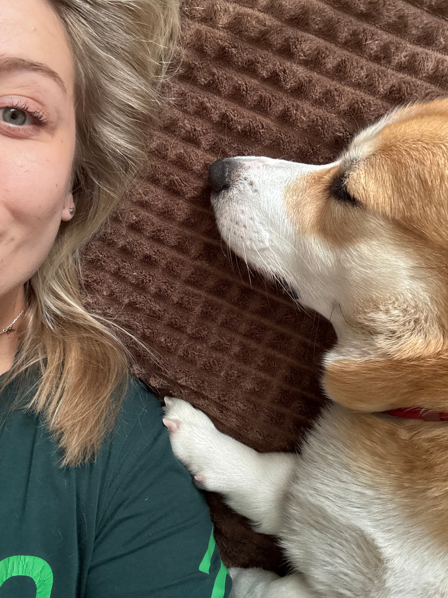 A close-up indoor shot shows a woman with blonde hair lying on a brown textured surface. A corgi dog, with a tan head and white body, is resting its head and paw on the same surface. The woman is wear…read more